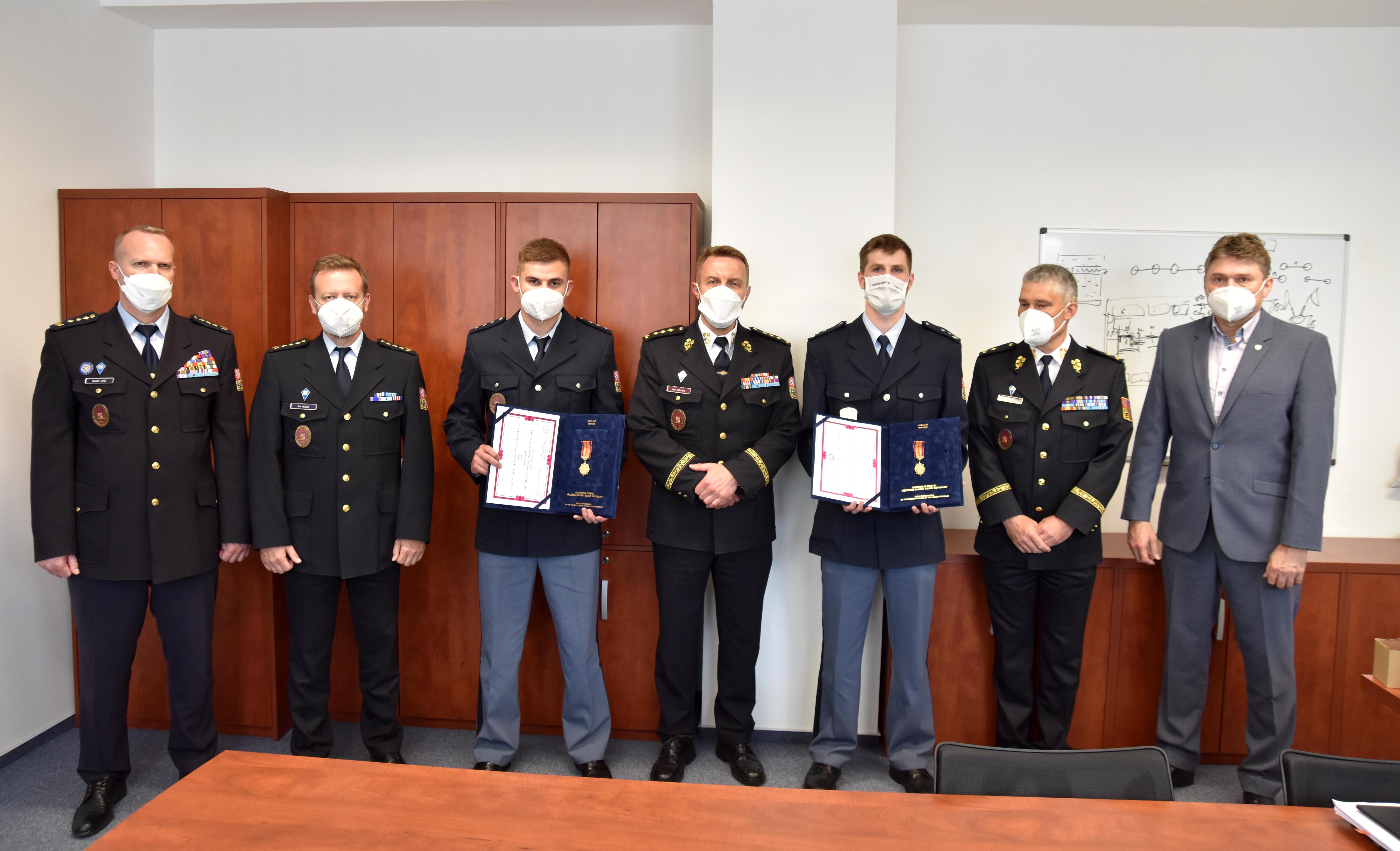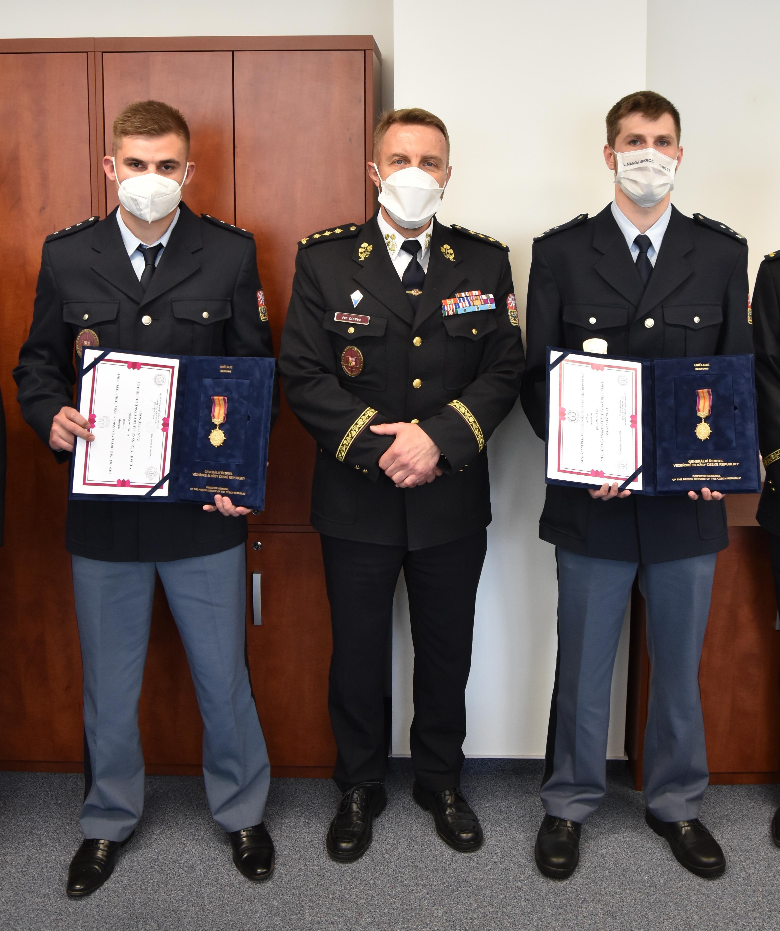 PRAHA 27. května (VS ČR) - Medailí Vězeňské služby ČR za statečnost vyznamenal dnes generální ředitel VS ČR Petr Dohnal dva příslušníky sboru z brněnské justiční stráže a z Věznice Rýnovice, kteří svým včasným zásahem a kvalifikovaným poskytnutím první pomoci zachránili při dvou různých příležitostech dva lidské životy. Medaile VS ČR za statečnost je nejvyšším resortním vyznamenáním.