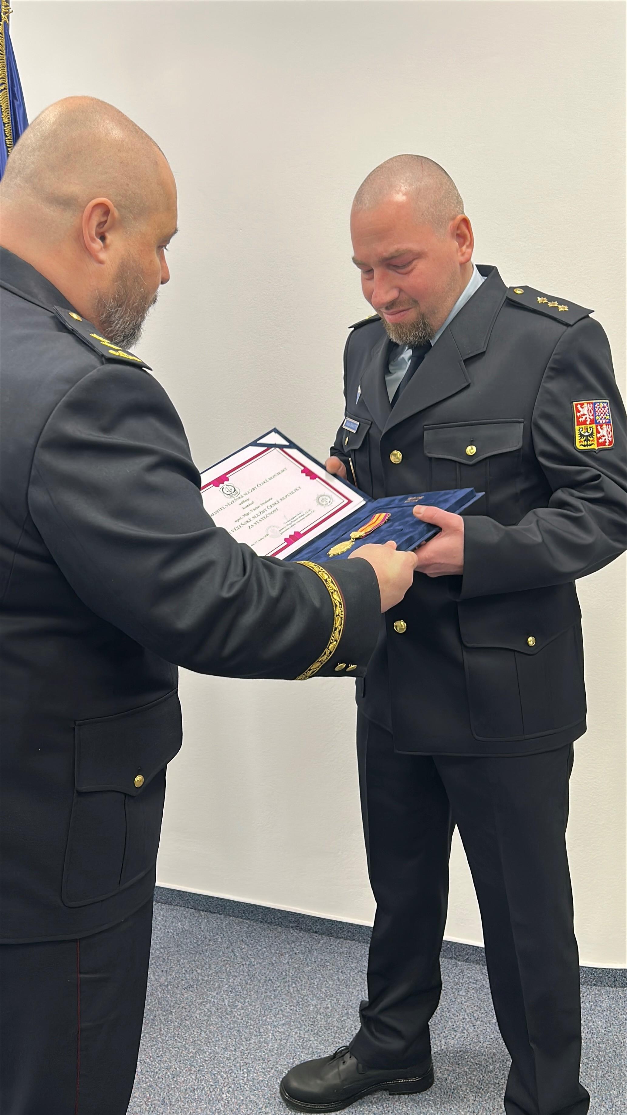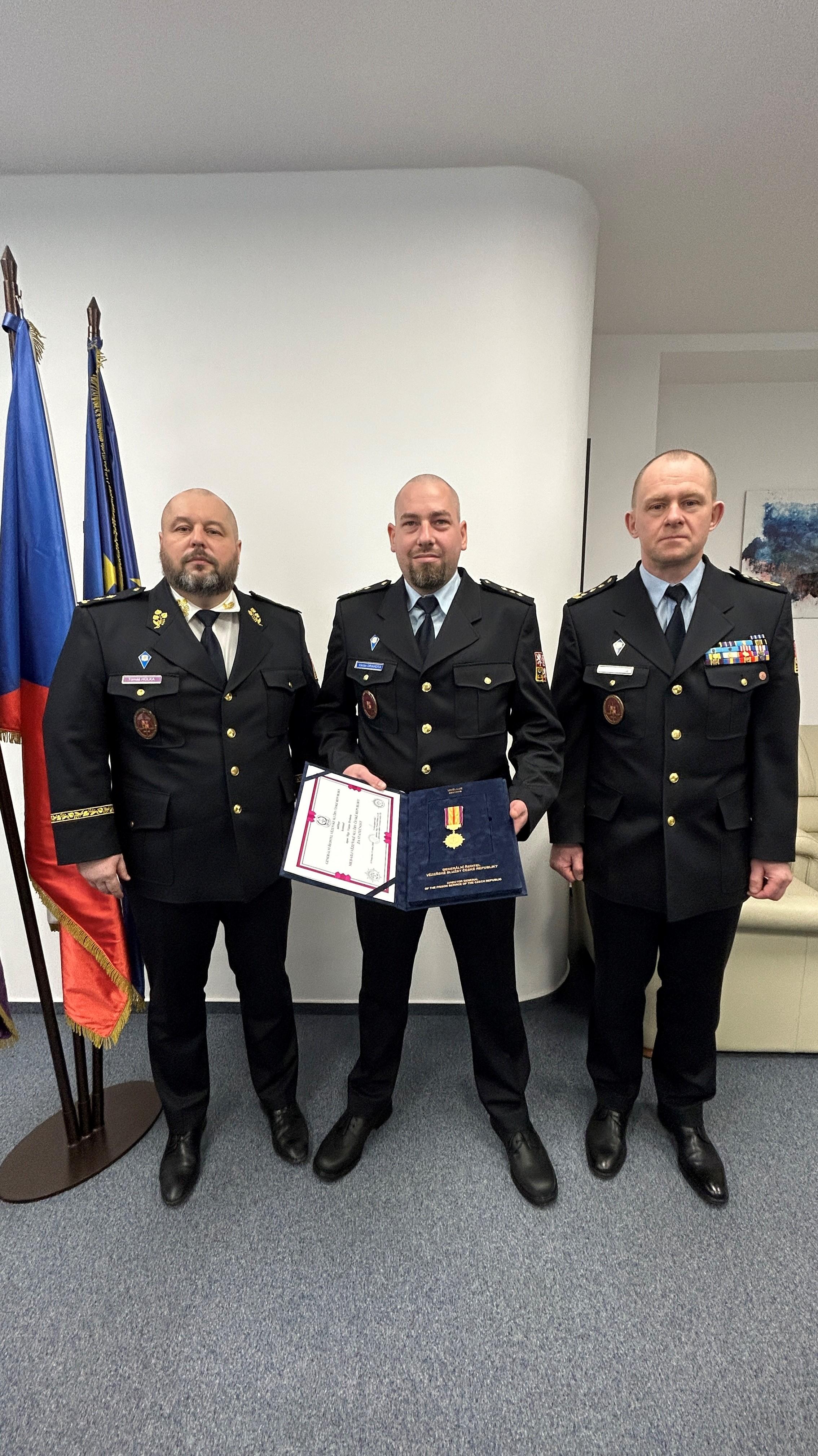 PRAHA 24. února (VS ČR) - Medaili Vězeňské služby ČR Za statečnost dnes předal generální ředitel Vězeňské služby České republiky genmjr. Tomáš Hůlka nadporučíkovi Václavu Drahotovi za jeho mimořádně odvážný čin, kdy výrazně přispěl k záchraně dvou lidských životů.