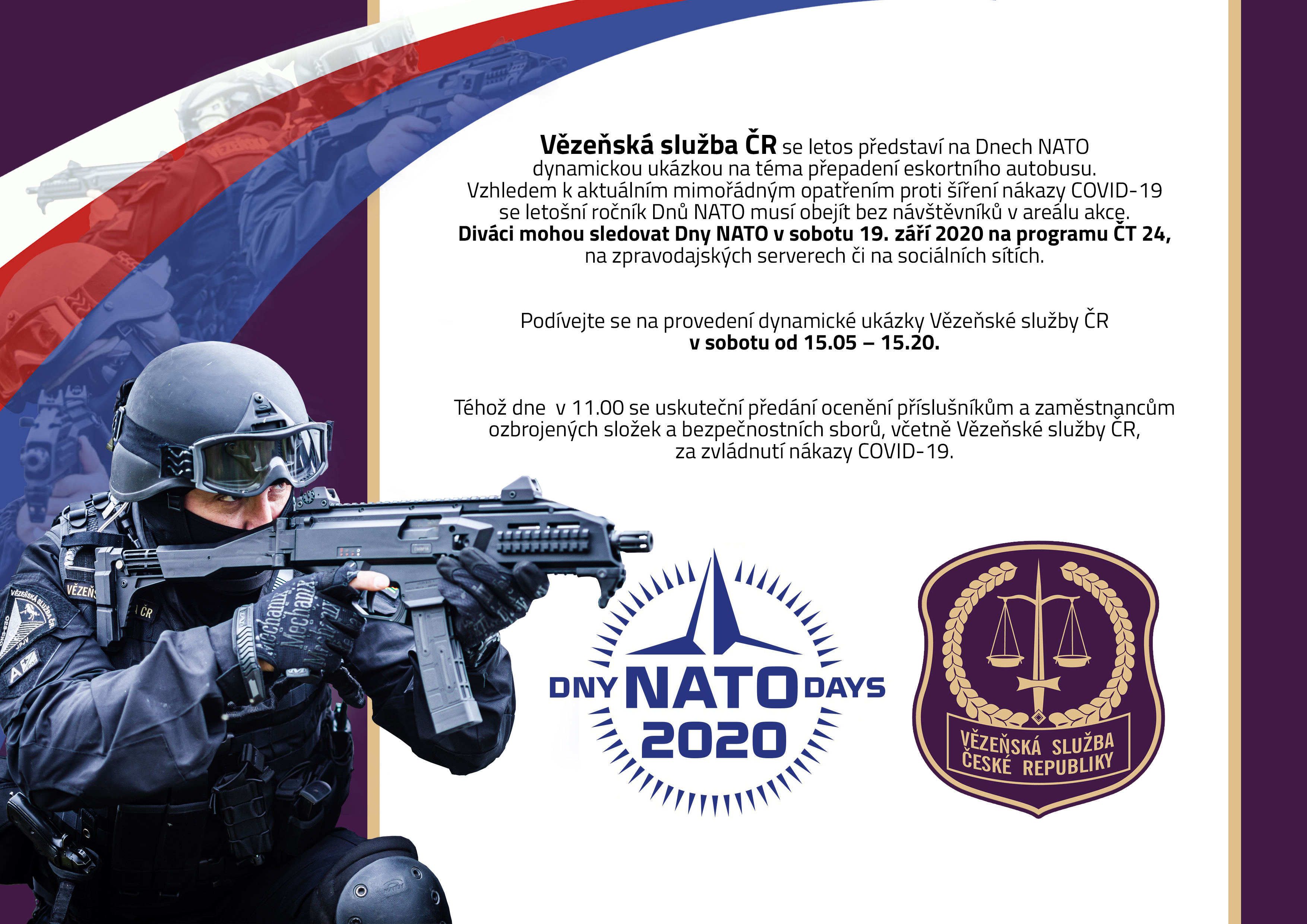 PRAHA 14. září (VS ČR) - Vězeňská služba ČR se i letos představí na tradiční přehlídce ozbrojených sil Dny NATO 2020. Vzhledem k protiepidemickým opatřením se Dny NATO letos uskuteční bez přímé účasti diváků v areálu mošnovského letiště. Dynamické ukázky a další události z přehlídky mohou diváci sledovat prostřednictvím televize, zpravodajských serverů či sociálních sítí.