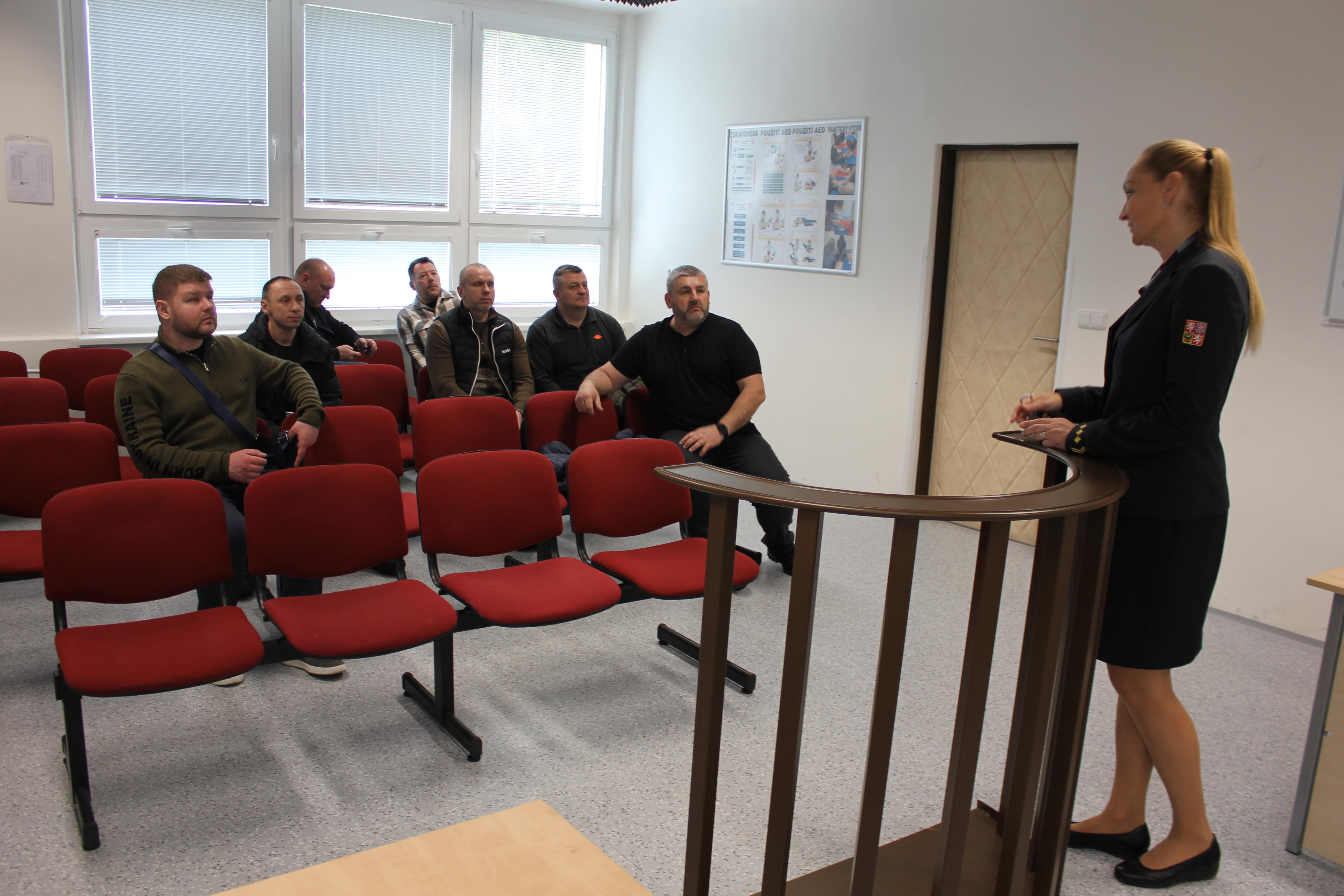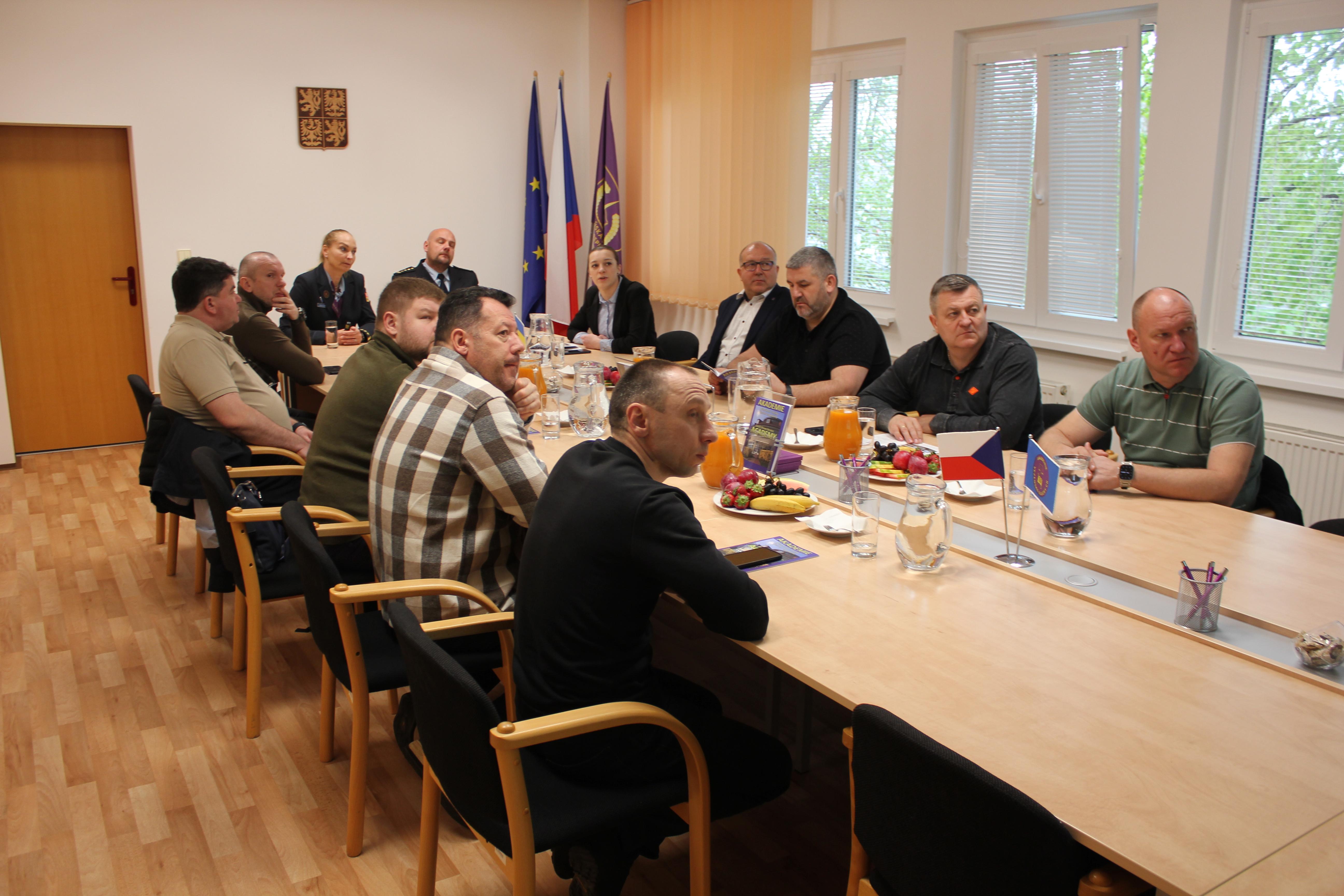 Ředitelka Martina Gänsel a její 1. zástupce Lukáš Kozaczka seznámili přítomné s historií a činností Akademie VS ČR. Rovněž představili nově vybudované stravovací zařízení. Následovala prohlídka samotné budovy, při které kolegové z Ukrajiny mohli nahlédnout do výuky a měli možnost navštívit místnost se zakázanými předměty, střeleckou učebnu, DOJO, posilovnu a kondiční místnost nebo také knihovnu.