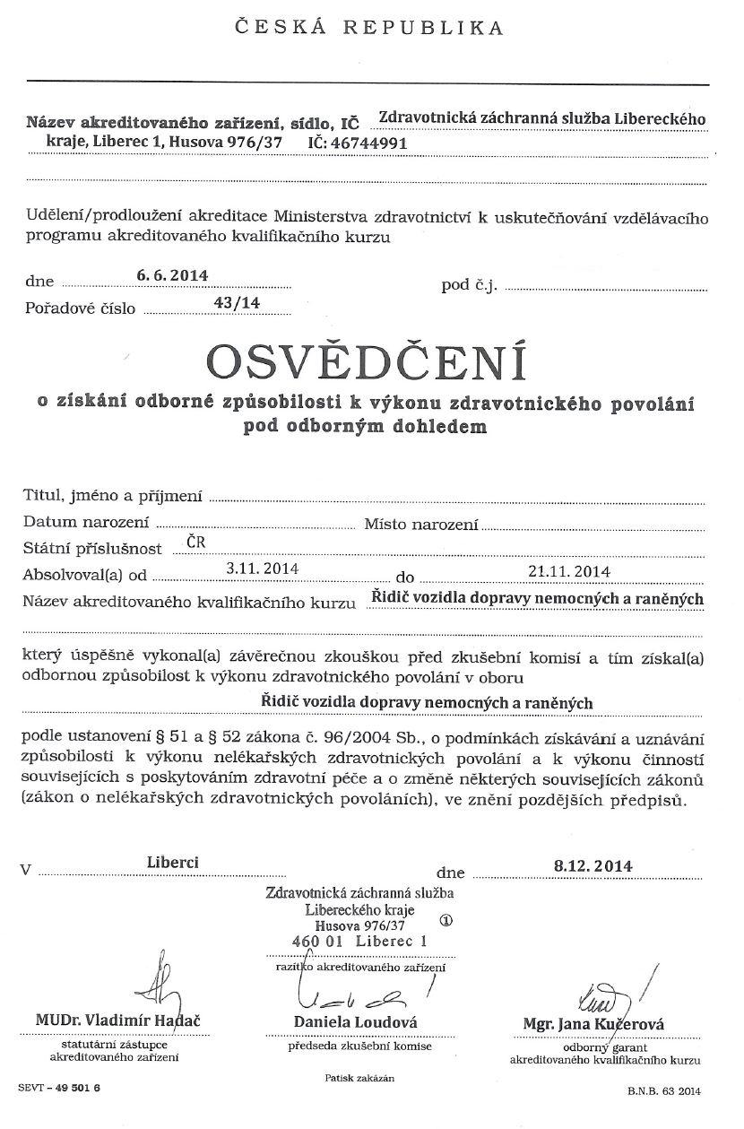 Kurz řidičů dopravy nemocných a raněných