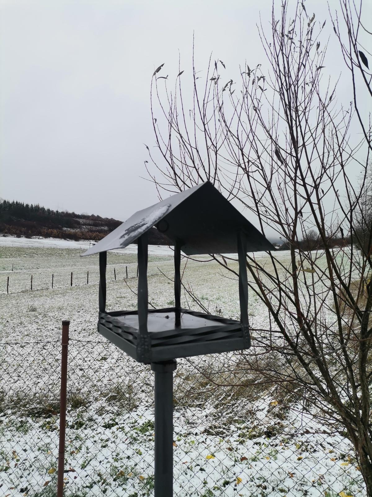 „Konstrukci se stříškou jsme vyrobili kompletně ze železa a ošetřili proti korozi, aby odolala nepříznivému počasí.“ komentoval mistr odborného výcviku školského vzdělávacího střediska (ŠVS) Valdice Josef Bárta, který krmítko přivezl a umístil na určené místo.