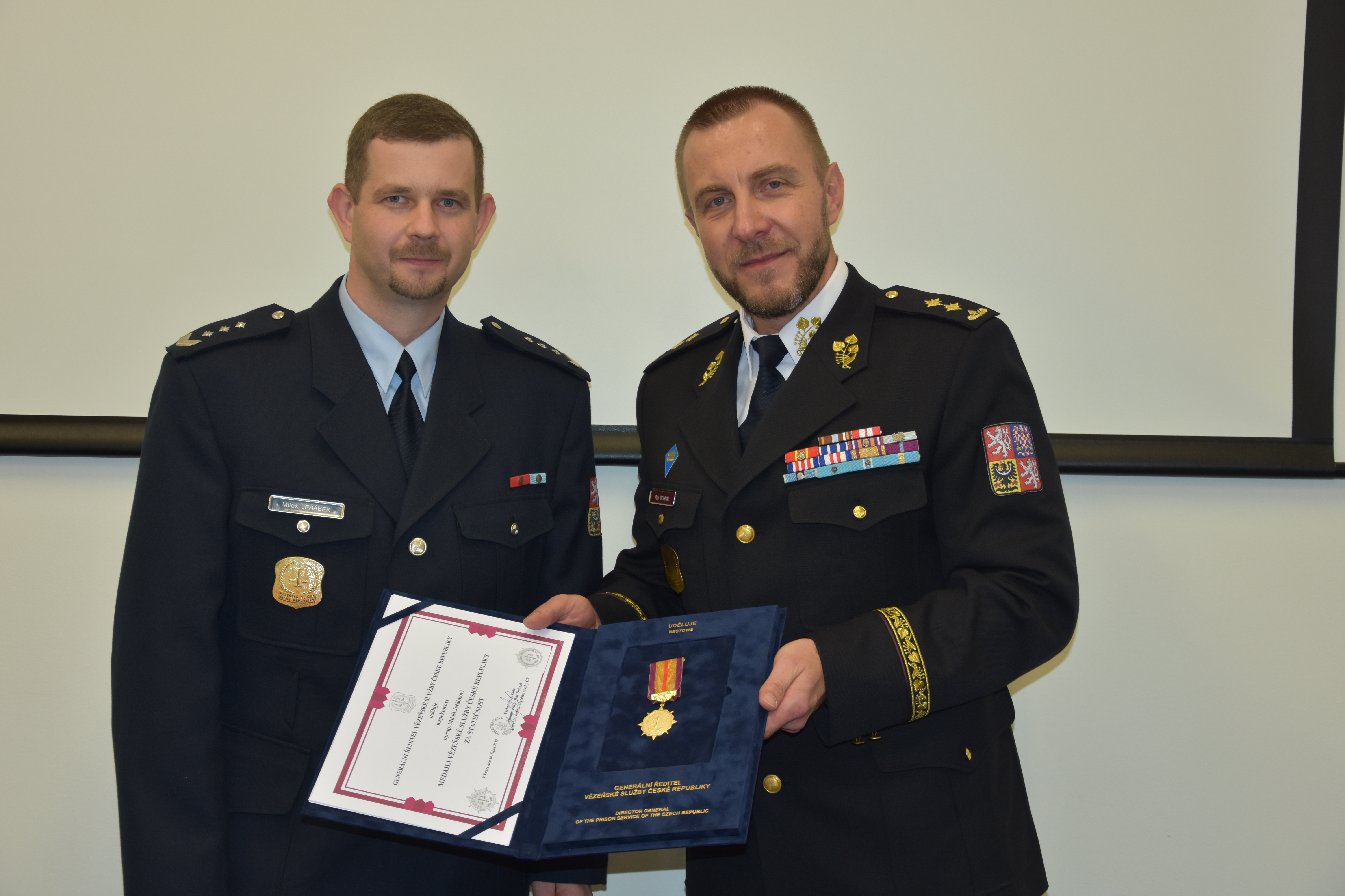 BRNO 15. listopadu 2017 (VS ČR). Dne 13. listopadu převzal z rukou generálního ředitele VS ČR genmjr. PhDr. Petra Dohnala nadpraporčík Miloš Jeřábek medaili za statečnost.