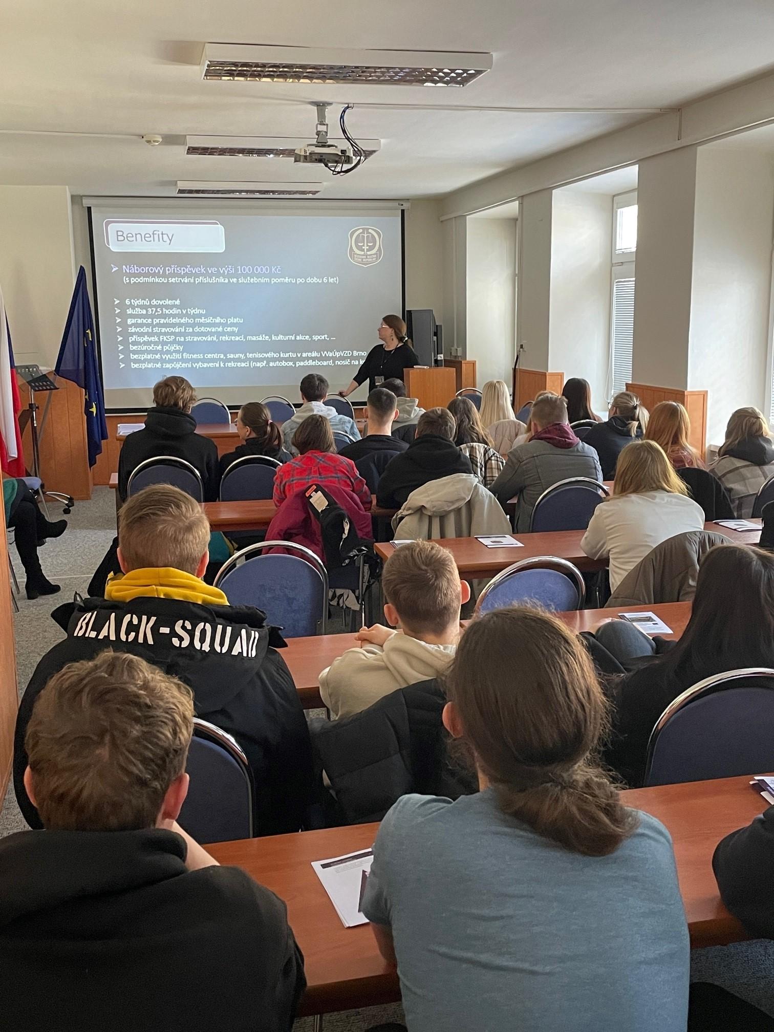 Studenti maturitního ročníku, jejichž kurikulum je zaměřeno zejména na budoucí uplatnění ve státní správě a v ozbrojených složkách, se během návštěvy věznice mohli seznámit se základy práce vězeňské služby, jejími úkoly a související terminologií. V praktické části si návštěvníci prohlédli prostory, kde je vykonávána vazba nebo trest odnětí svobody. Stejně jako tomu bylo i v minulosti v rámci obdobných exkurzí, i nyní byla součástí návštěvy úvodní přednáška s názornou prezentací a praktická ukázka vybavení příslušníků, které si studenti mohli na vlastní kůži i vyzkoušet. Velký zájem opět vzbudil projekt vychovatelky Mgr. Markéty Bendové v podobě besedy s odsouzeným zaměřené na prevenci užívání drog pod názvem: „Drogy nemají happy end“. Samozřejmě nemohla chybět ani náborová kampaň pod vedením zkušené personalistky Bc. Jany Hudečkové. Brněnská věznice tímto poutavým způsobem cílí na potenciální zájemce o zařazení do služebního poměru. Následovala vlastní prohlídka věznice, které se zhostili npor. Mgr. Dušan Raab a Mgr. Zuzana Bratová, kteří jsou za brněnskou věznici garanty těchto akcí. Za zmínku stojí určitě i skutečnost, že v rámci zpětné vazby dva ze studentů ihned projevili vážný zájem o zařazení do služebního poměru po ukončení studia.
