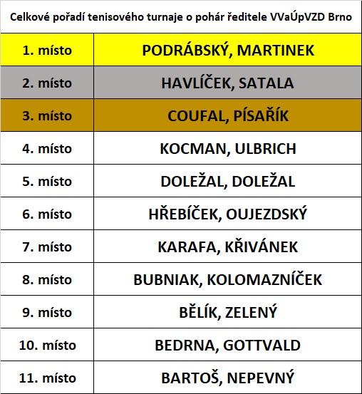 Ve finálovém deblu proti sobě nastoupili František Satala s Michalem Havlíčkem proti Tomáši Podrábskému s Alešem Martinkem. V napínavém finále byla nakonec úspěšnější druhá dvojice, která zaslouženě z Rajhradu odváží nejen pohár za 1. místo, ale také putovní pohár ředitele.