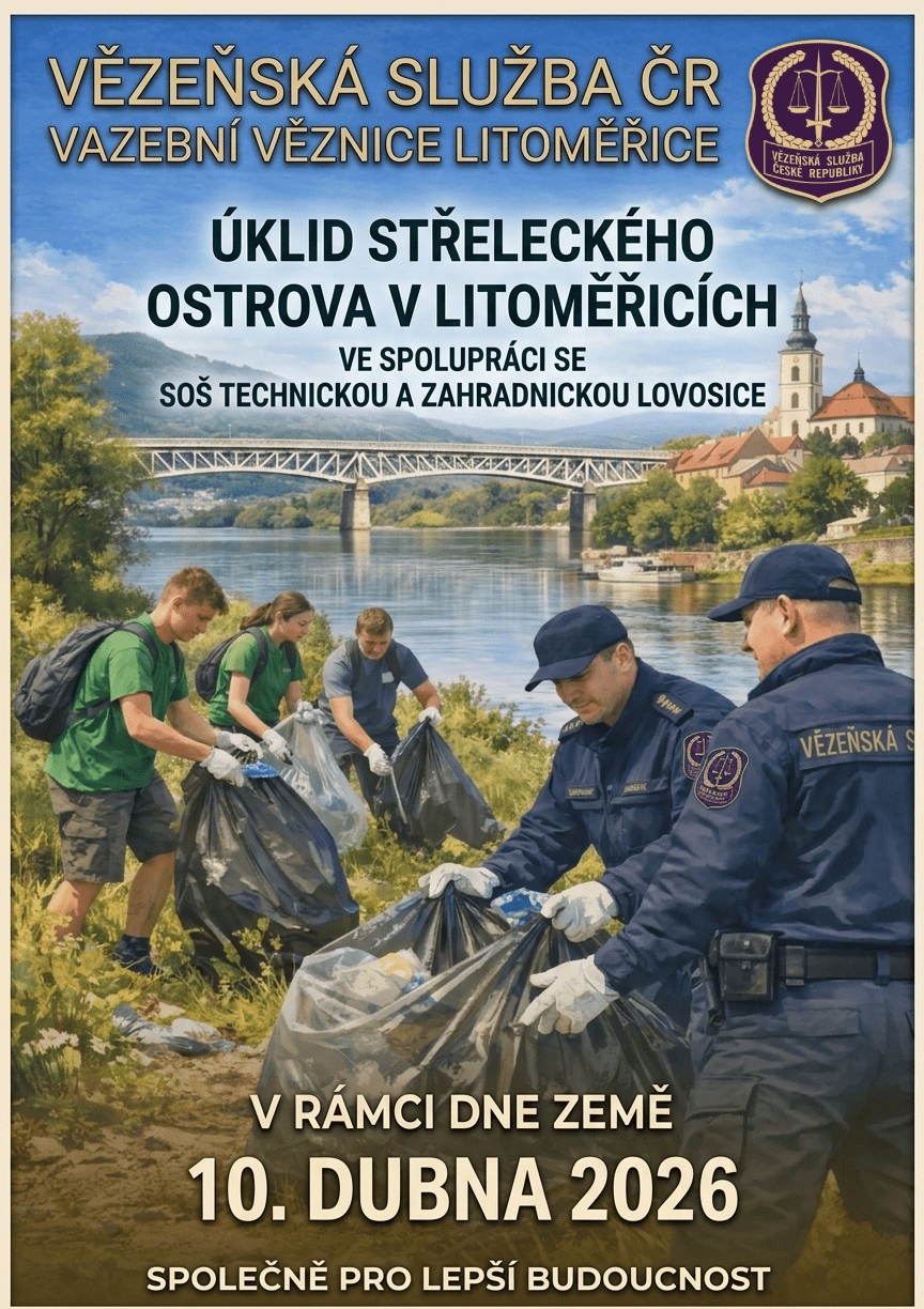 Dne 10. 4. 2026 se uskutečnil 1. ročník akce Den Země – Ukliďme Česko, pořádaný Vazební věznicí Litoměřice ve spolupráci se SOŠ technickou a zahradnickou Lovosice. Navzdory nepříznivému počasí se do úklidu zapojilo přibližně 60 studentů a 15 zaměstnanců vazební věznice. Zázemí poskytl Veslařský klub Slavoj Litoměřice z.s., odkud účastníci vyrazili podél vlakové trati kolem mlýna až k Lodnímu náměstí a následně přes skatepark zpět k veslařské loděnici, kdy se podařilo shromáždit zhruba deset velkých pytlů tříděného odpadu.
