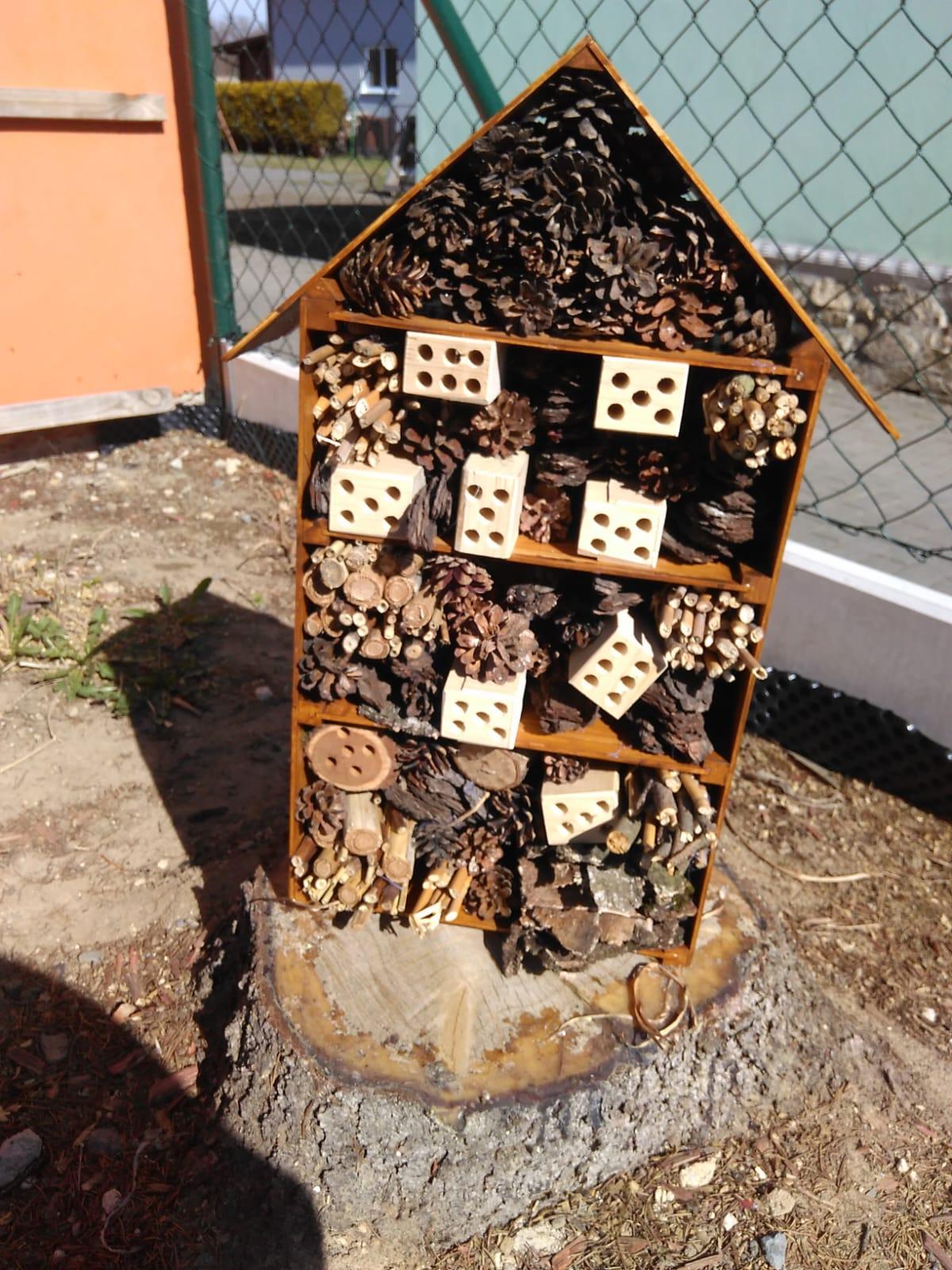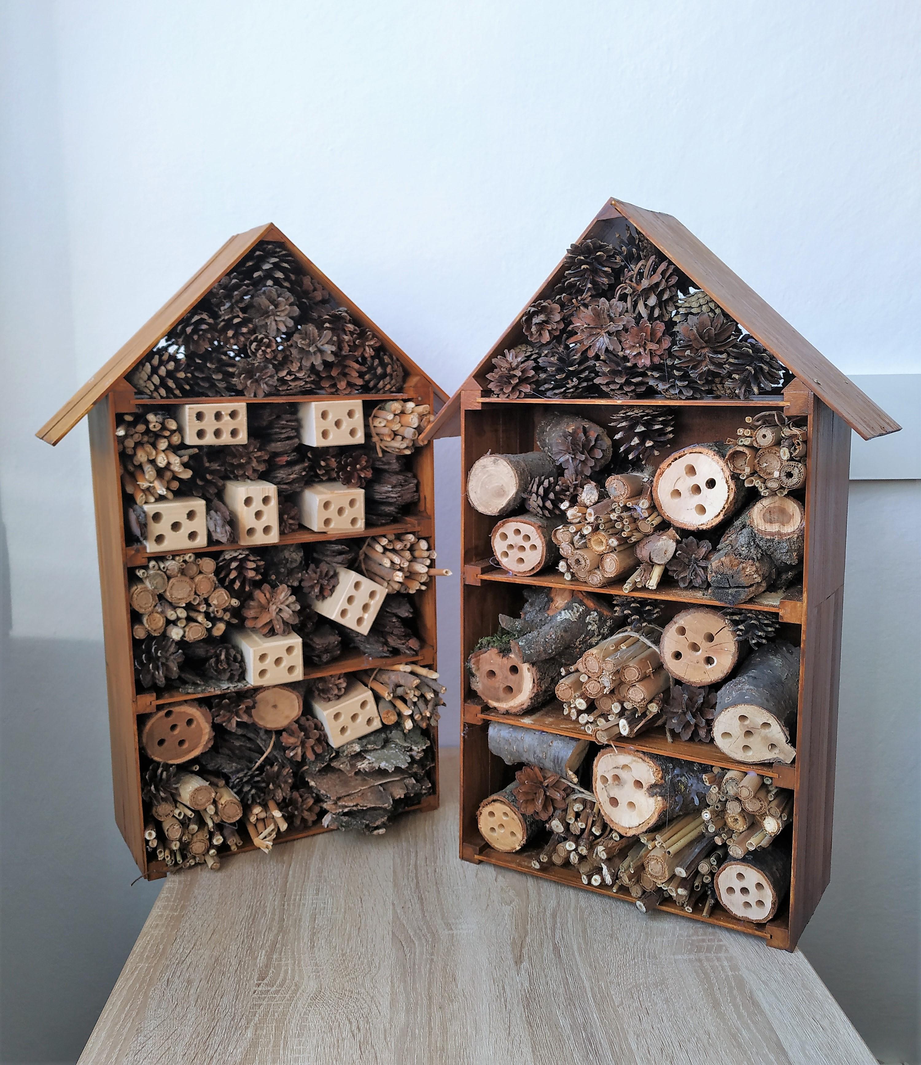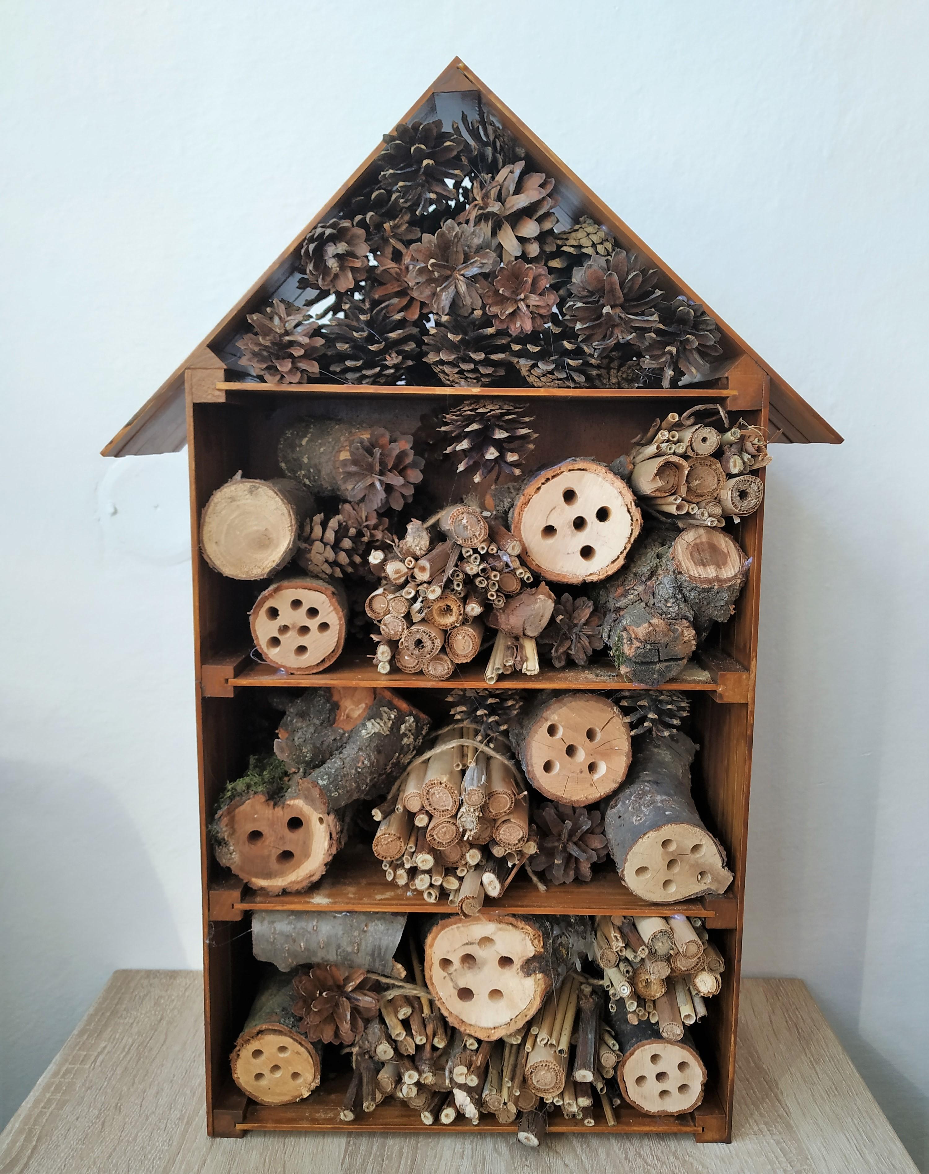 Hmyzí domeček je vyplněn různými druhy přírodního materiálu s cílem poskytnout hmyzu náhradní prostředí, protož nejen v městském prostředí nachází stále méně vhodných míst pro svůj vývoj.