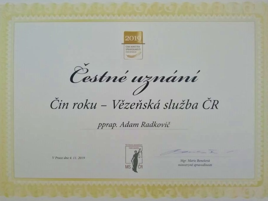 Jedno z ocenění pro rok 2019 za Vězeňskou službu ČR převzal také příslušník Adam Radkovič z Věznice Břeclav, kterým bylo čestné uznání - čin roku 2019 za záchranu života.