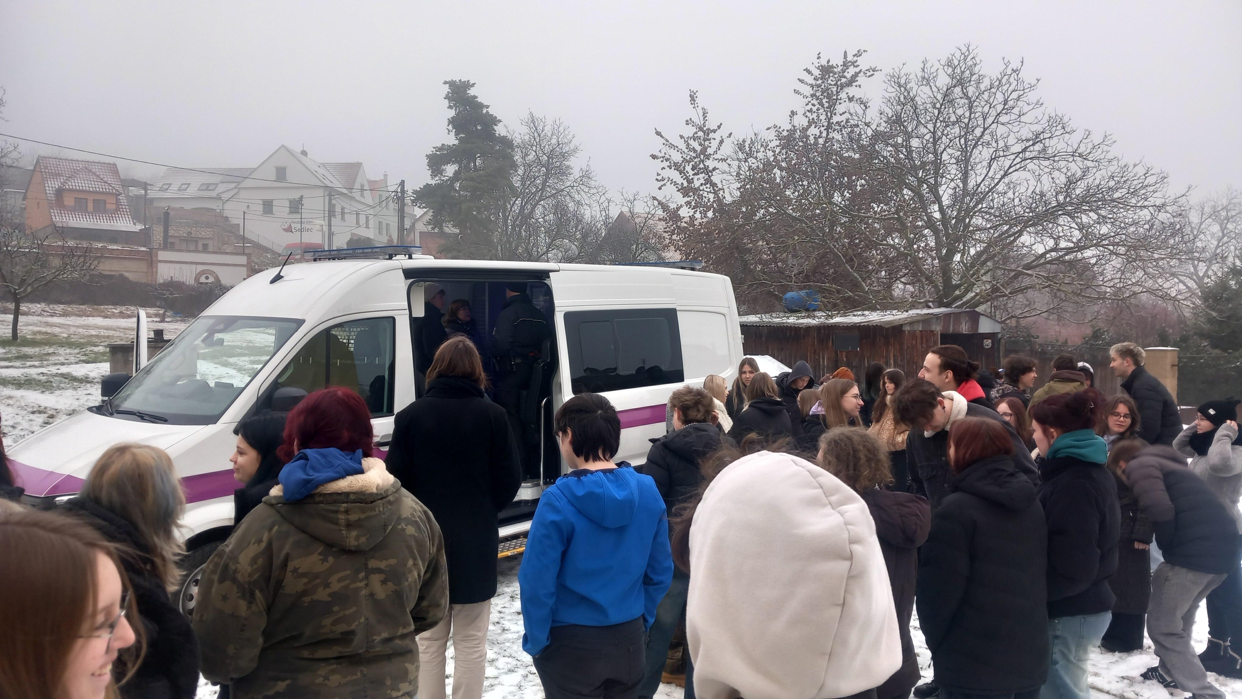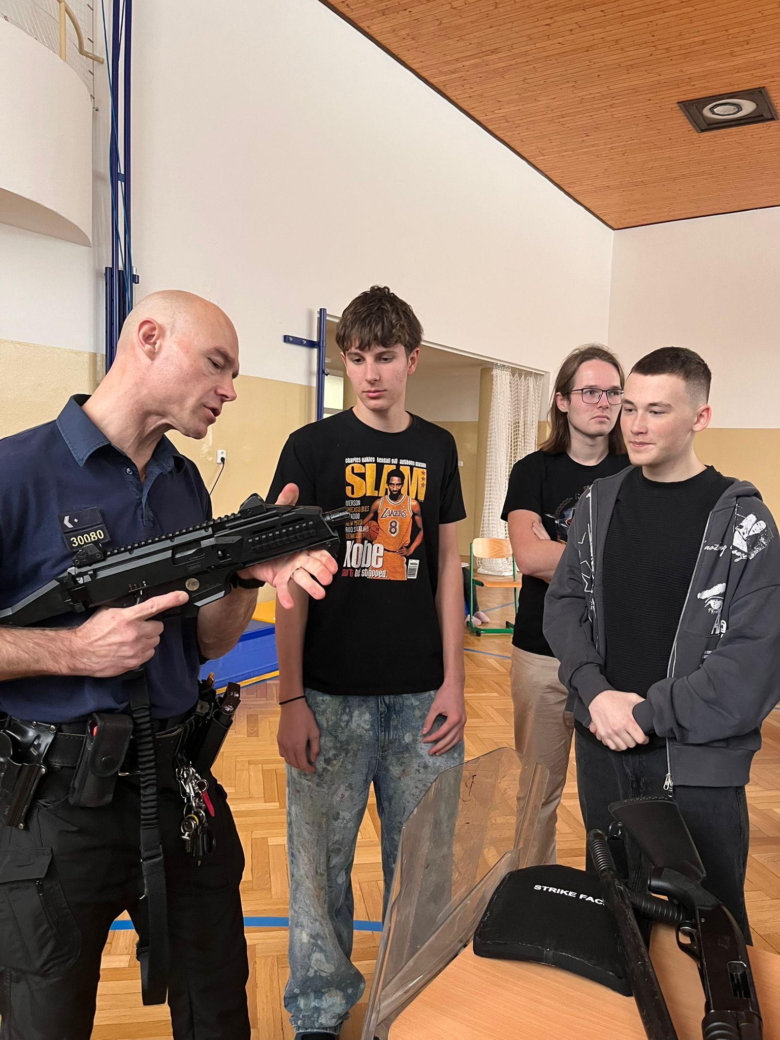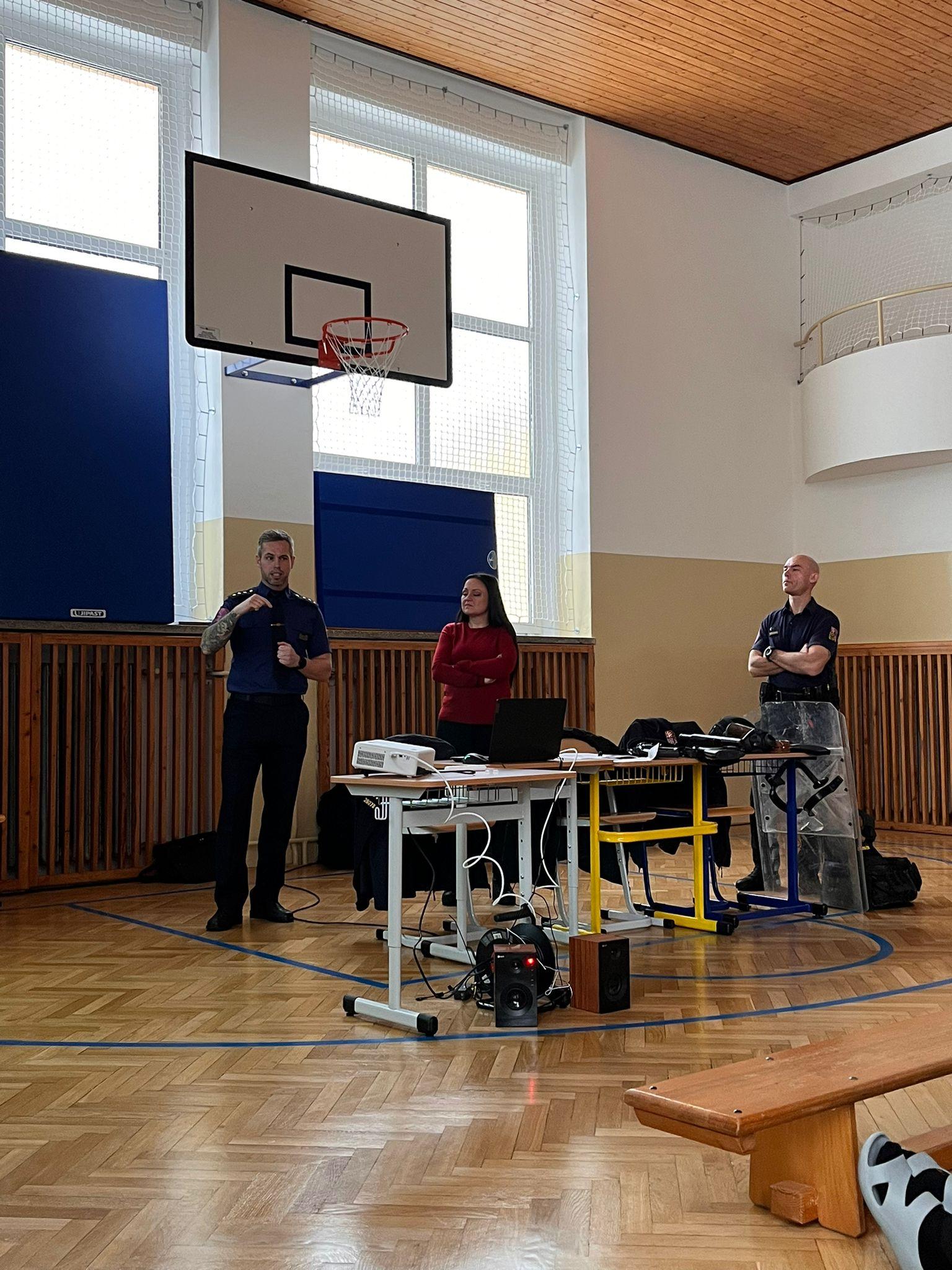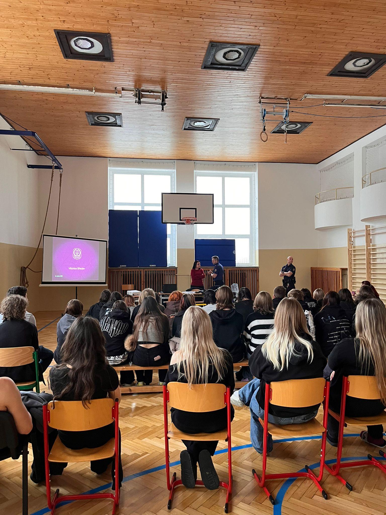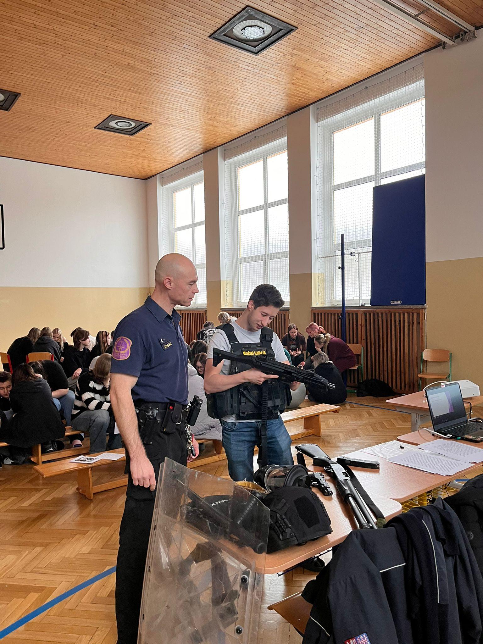 Soukromou střední průmyslovou školu navštívili příslušníci Jakub Goiš a Pavel Bělský a speciální pedagožka Lenka Vališová, aby se mohlo zúčastnit co nejvíce studentů, uskutečnilo se setkání v tělocvičně školy, kam dorazili všichni studenti i pedagogové.