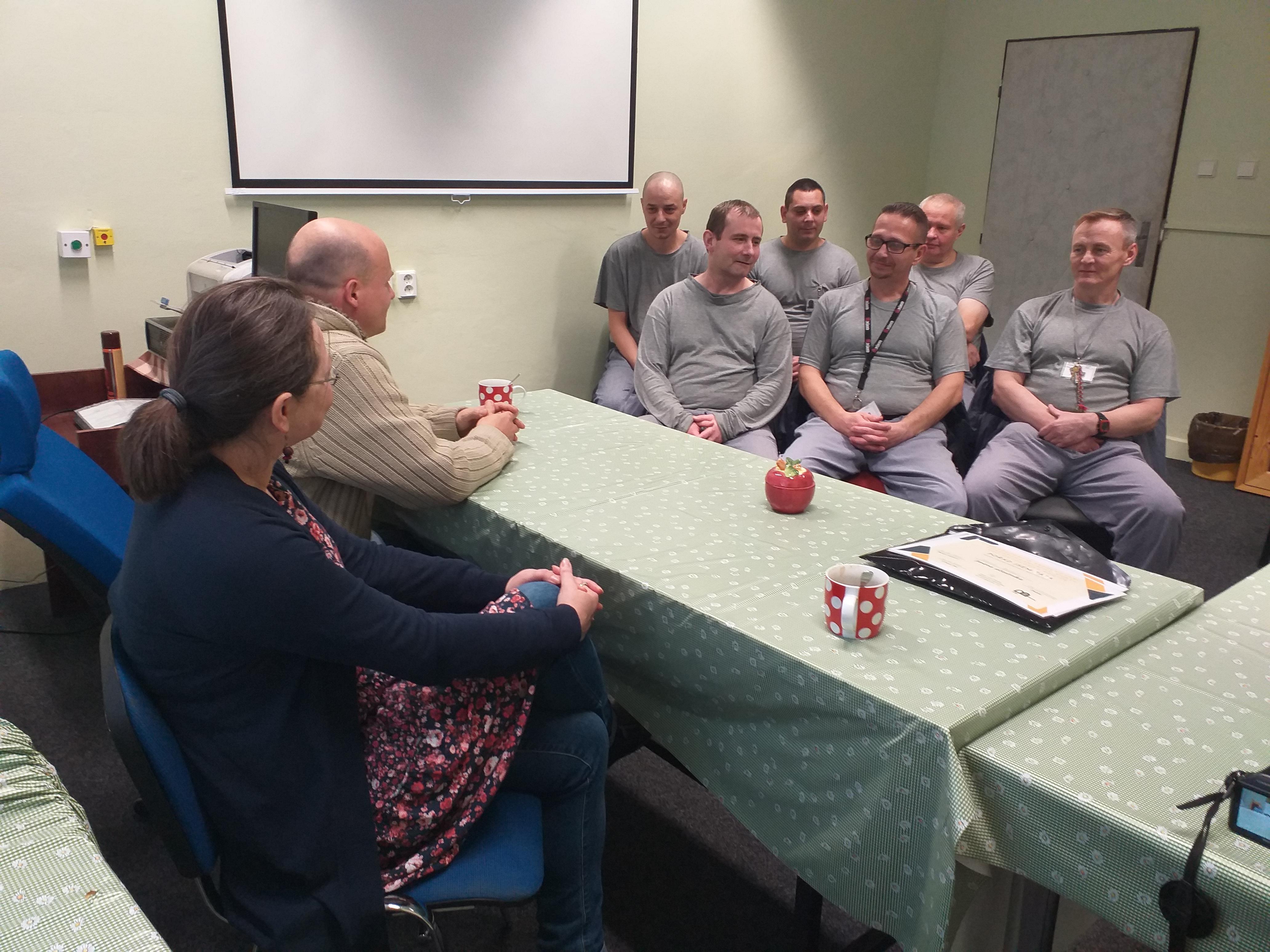 HORNÍ SLAVKOV 17. října (VS ČR) - V pátek se ve věznici uskutečnilo závěrečné osobní setkání odsouzených zařazených do kurzu "Pořád jsem táta" s pracovníky organizace Za branou panem Janem Frankem a paní Martinou Mossóczy, kteří úspěšným absolventům předali osvědčení.