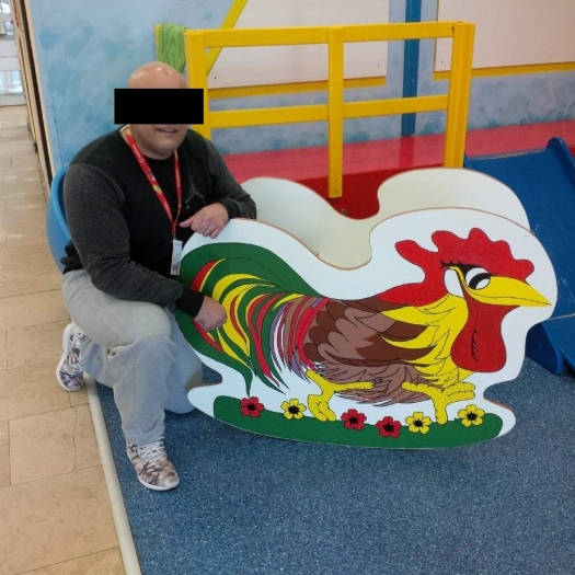 Ve Specializovaném oddělení pro odsouzené s duševní poruchou a poruchou chování ve Věznici Jiřice vyrobila skupina odsouzených v souvislosti s terapeutickým programem dřevěnou hračku – houpacího kohouta.