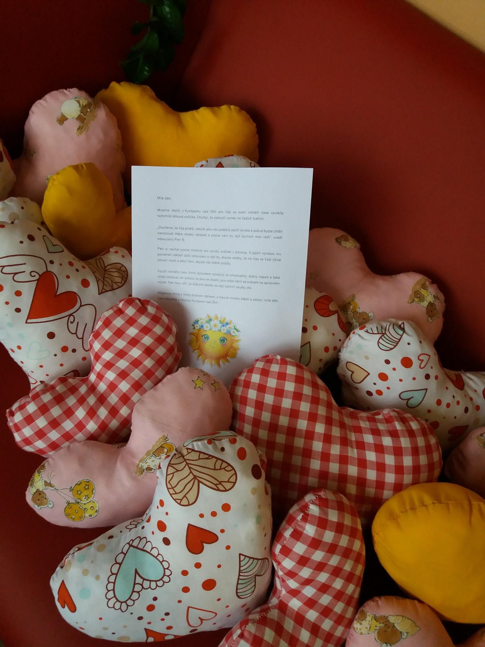 Spolu se srdíčky dostaly děti také dopis, kde se mj. píše: „Doufáme, že Vás potěší, stejně jako nás potěšila jejich výroba a pokud byste chtěly namalovat třeba nějaký obrázek a poslat nám ho, byli bychom moc rádi.“