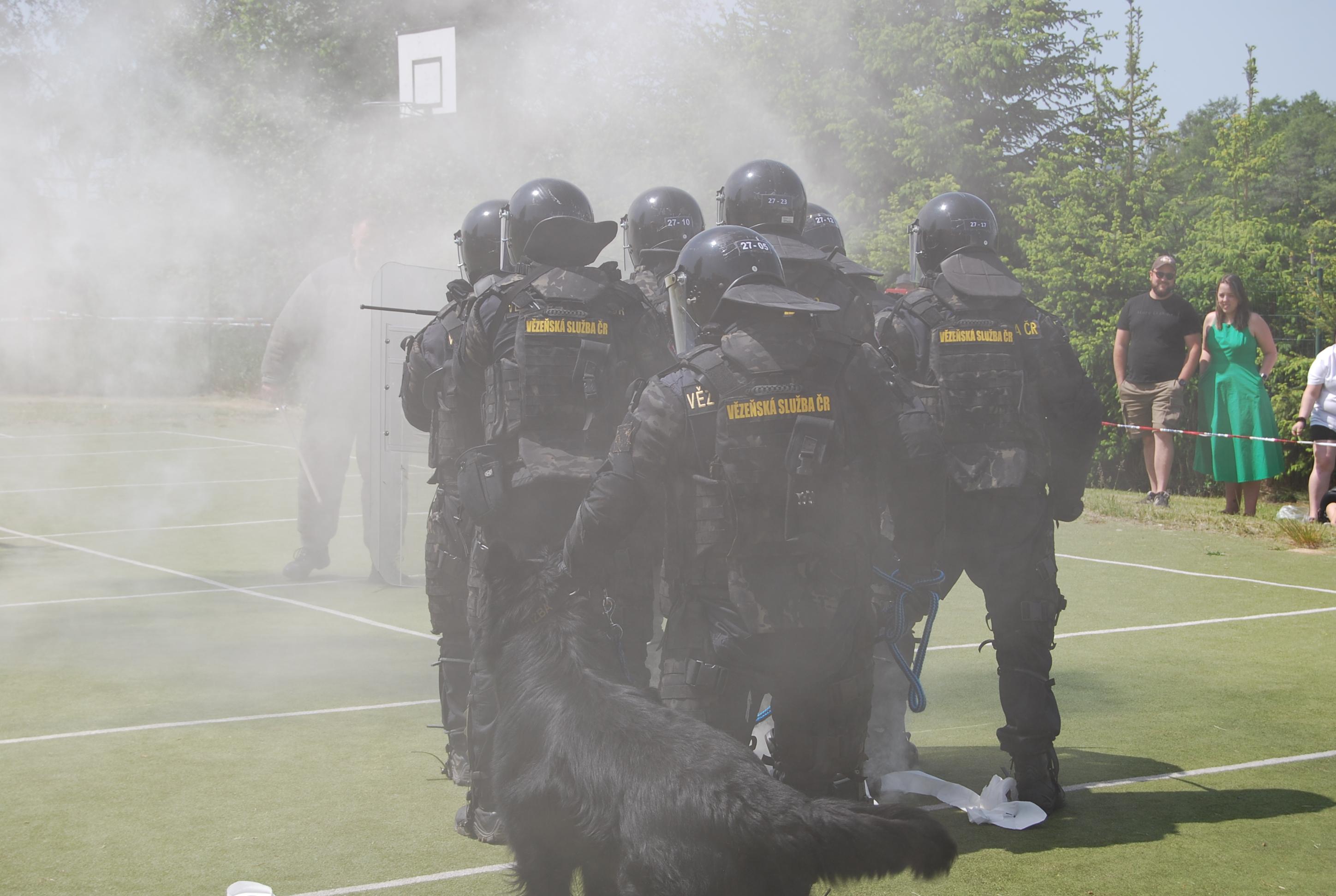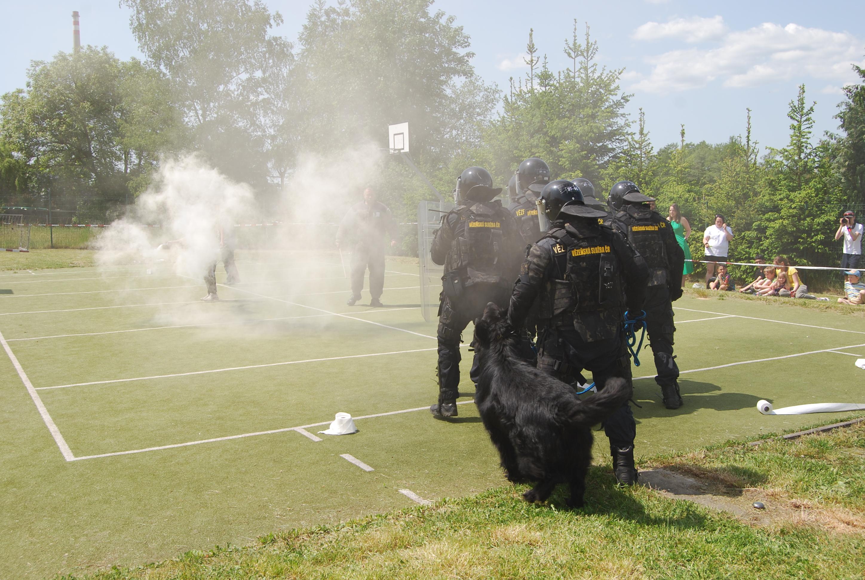 Skupina pro zákrok pod jednotným velením v těžkých ochranných kompletech, vyzbrojena štítem a obuškem předvedla účastníkům Dětského dne v Těšovicích ukázku zákroku proti pachateli, který odmítal uposlechnout pokyny vězeňské služby a kladl přetrvávající odpor.