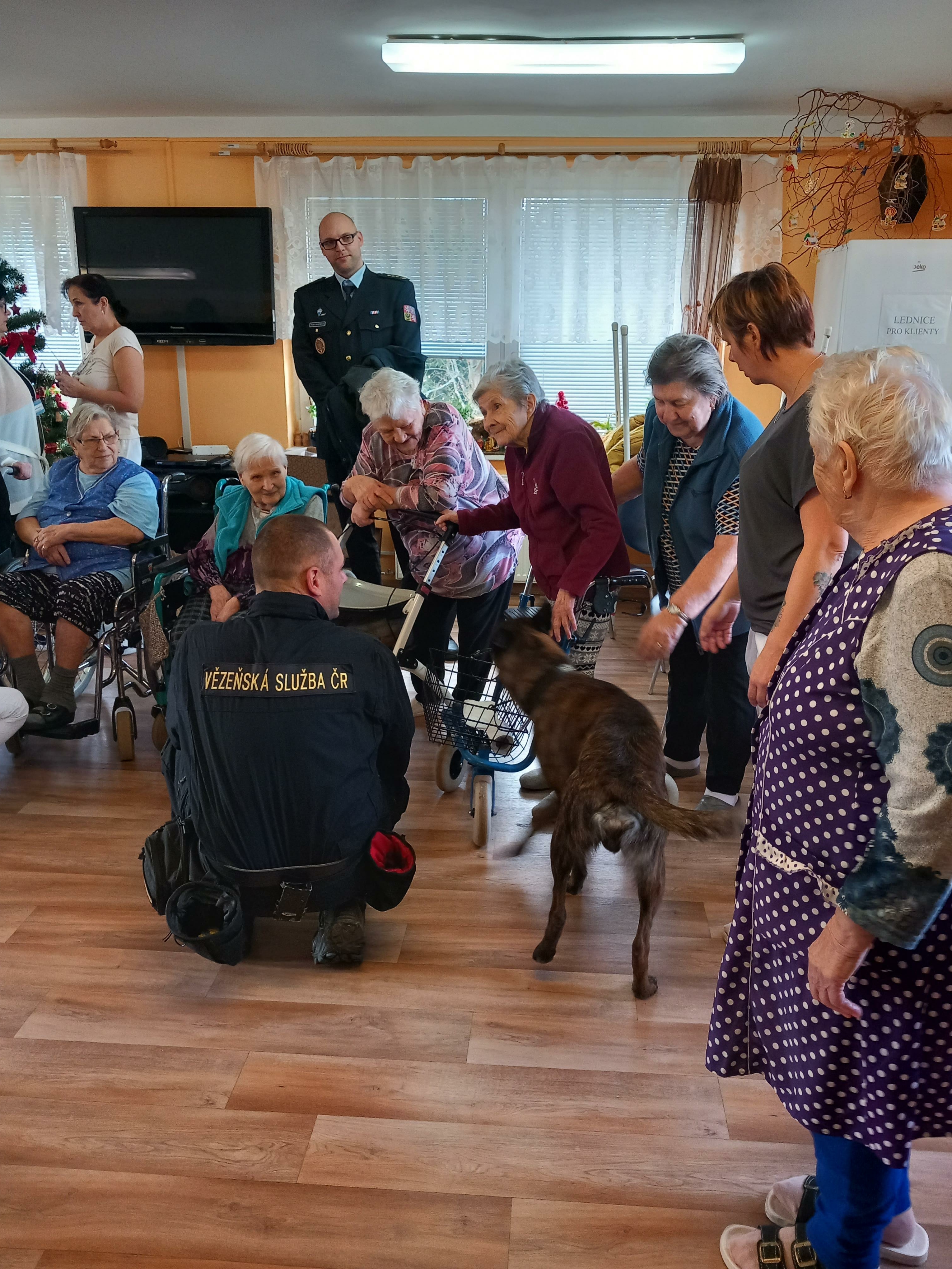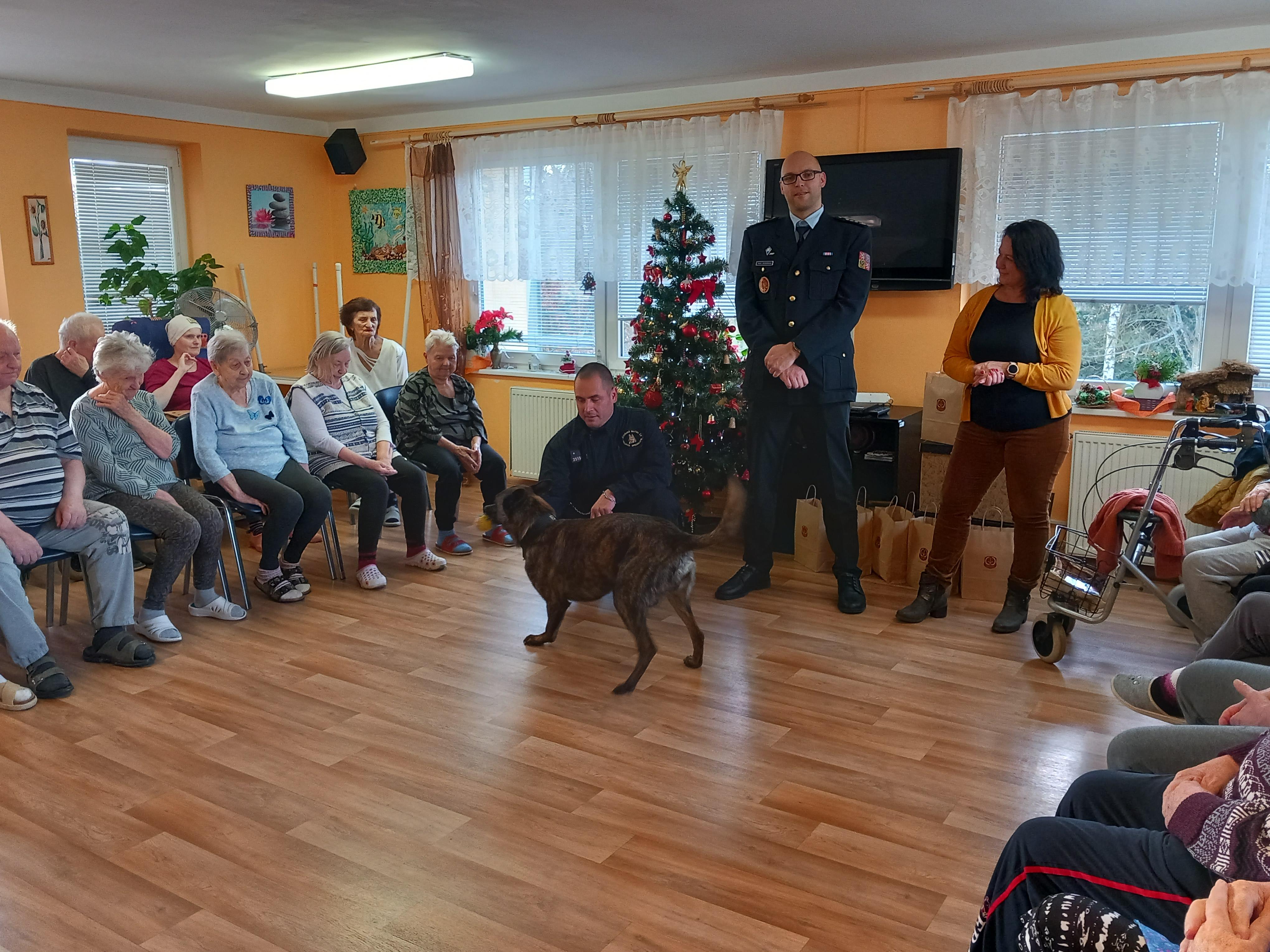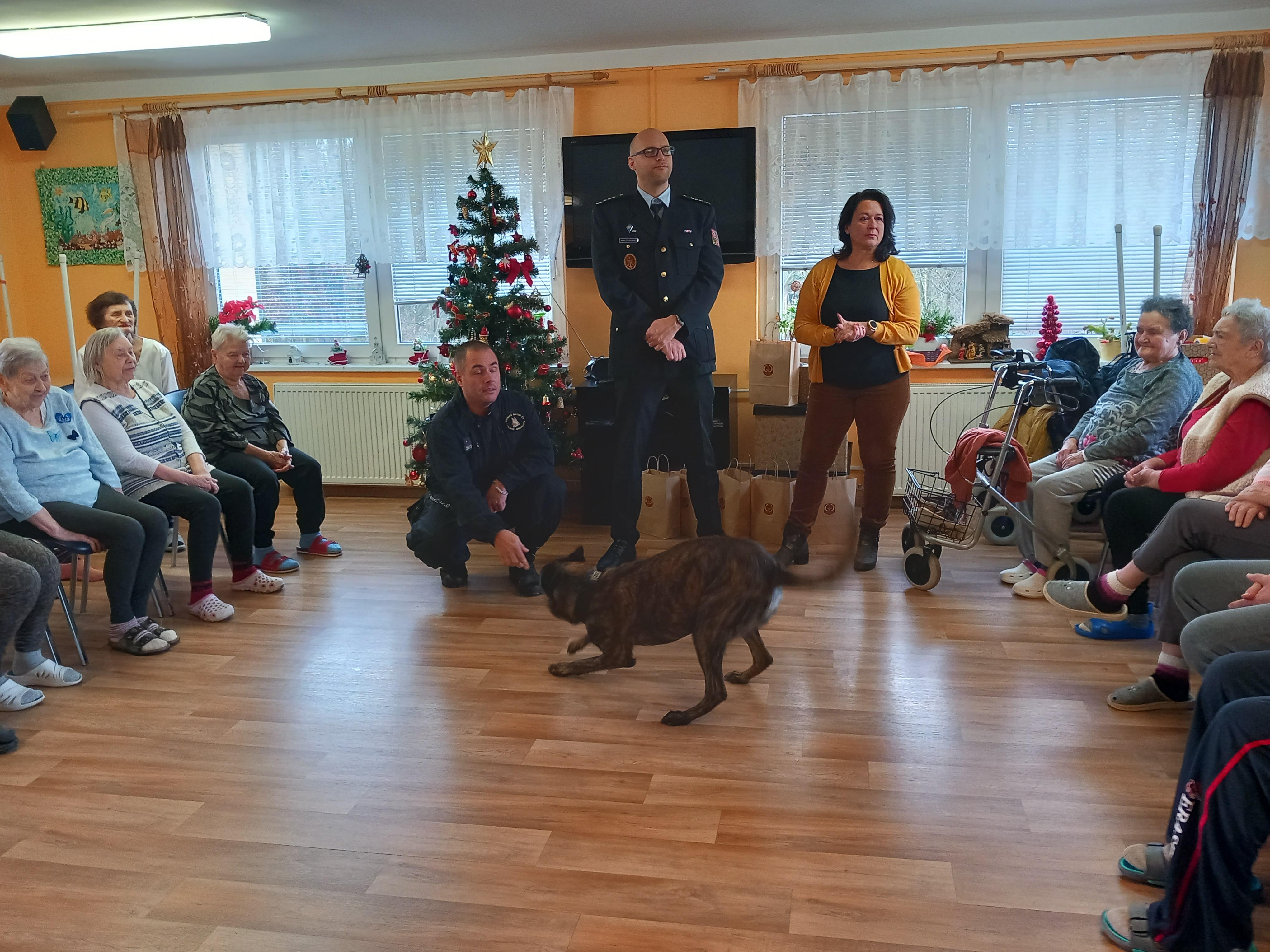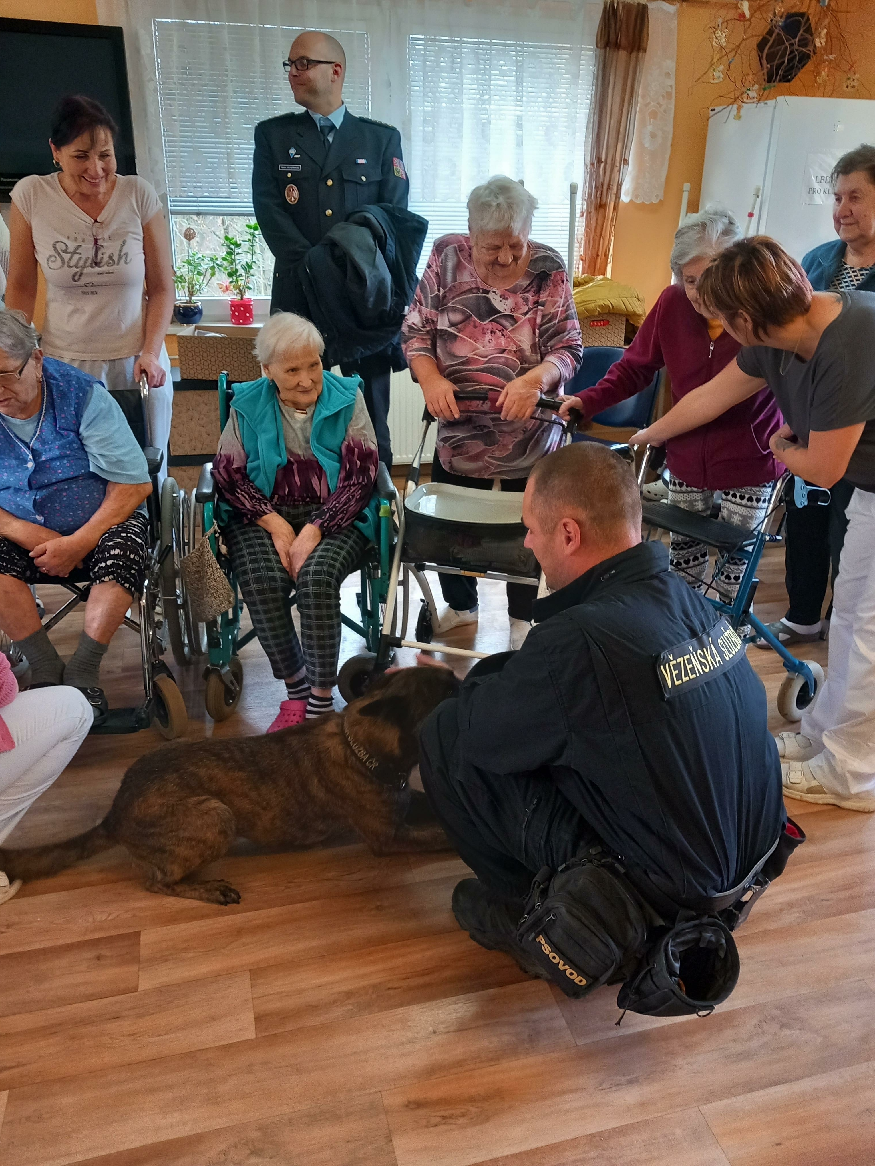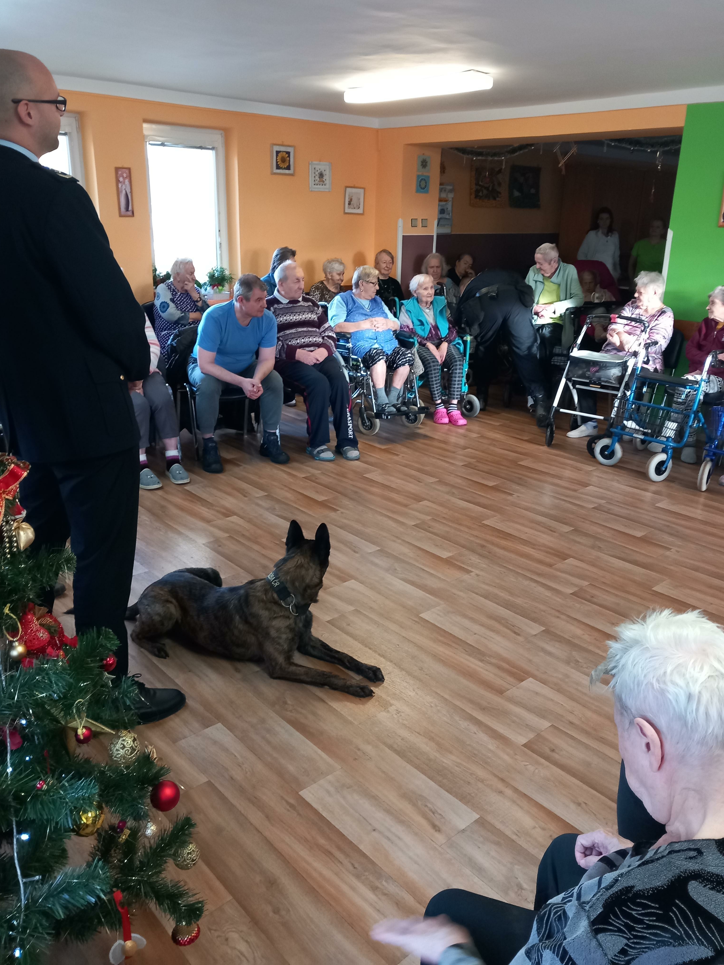 Velkou radost udělalo seniorům setkání se služebním psem Čertem, který jim předvedl některé své dovednosti. Čert byl velmi přátelský a kontaktní a rád se nechal od mnohých pohladit a zapózoval i při společném focení.