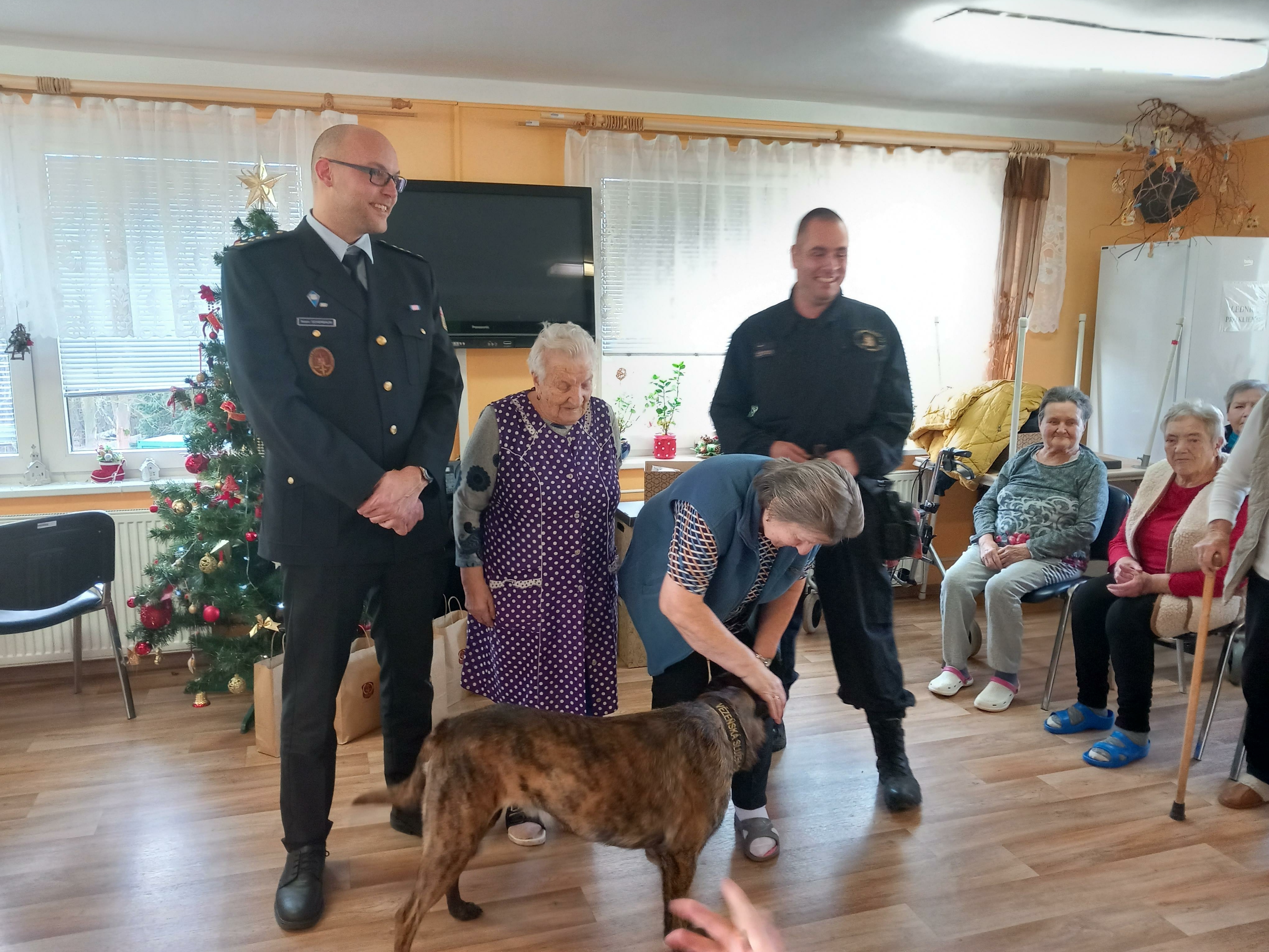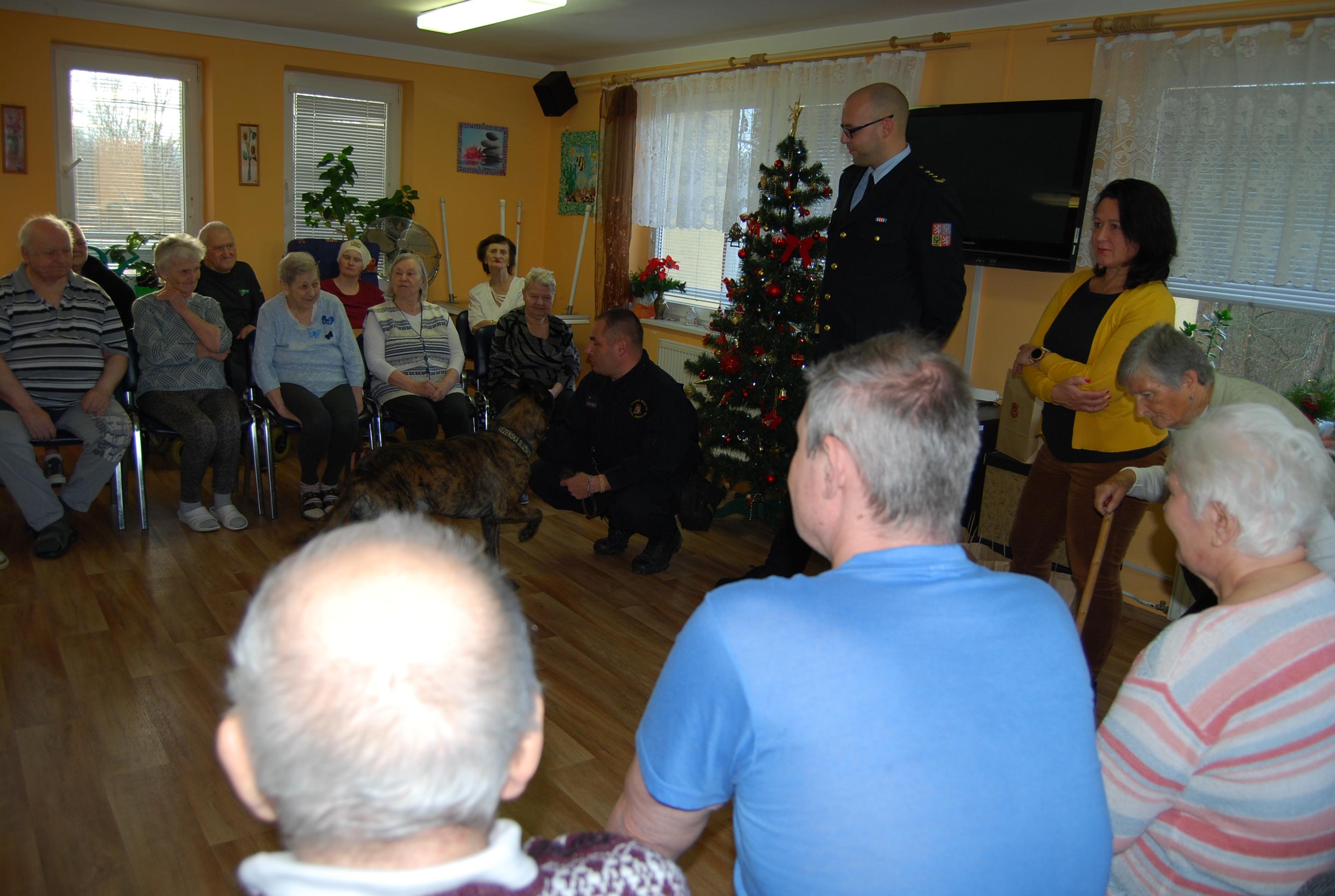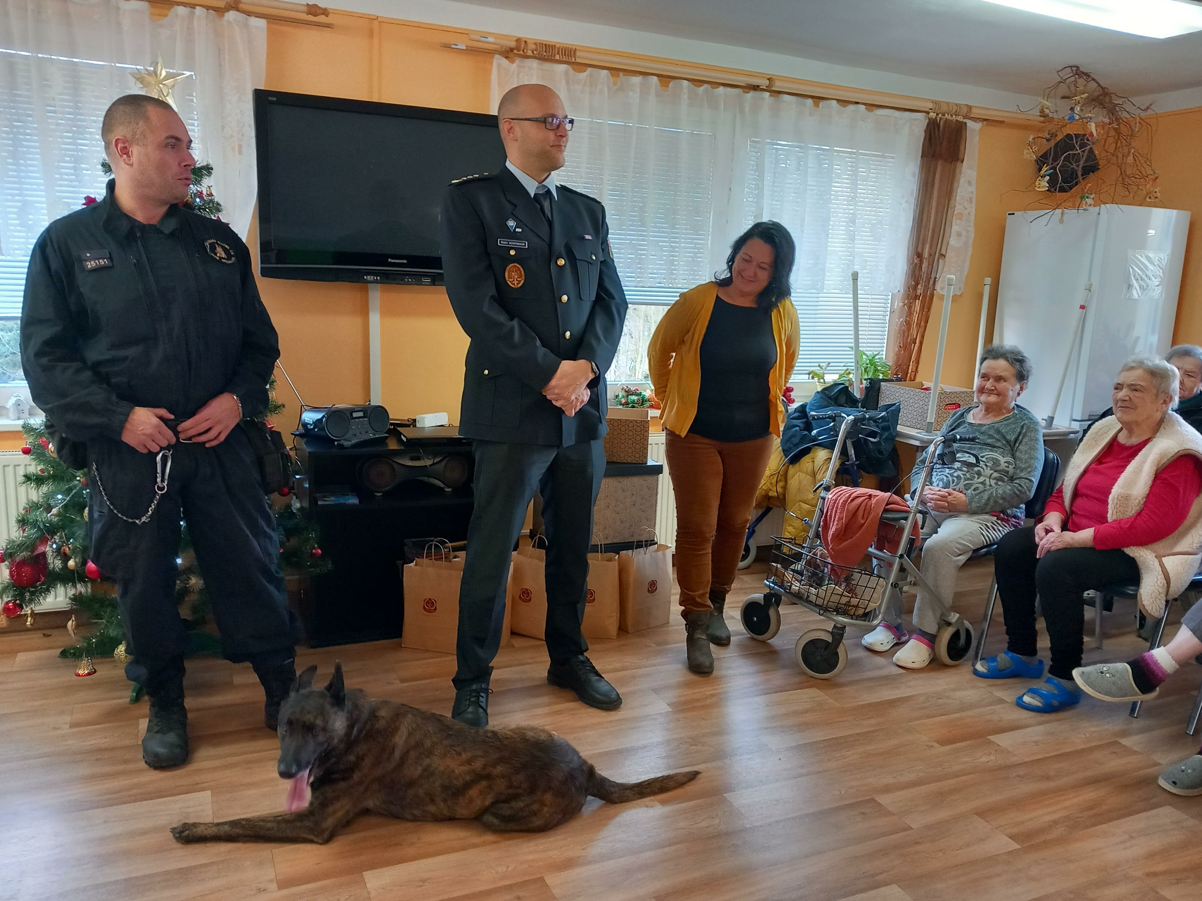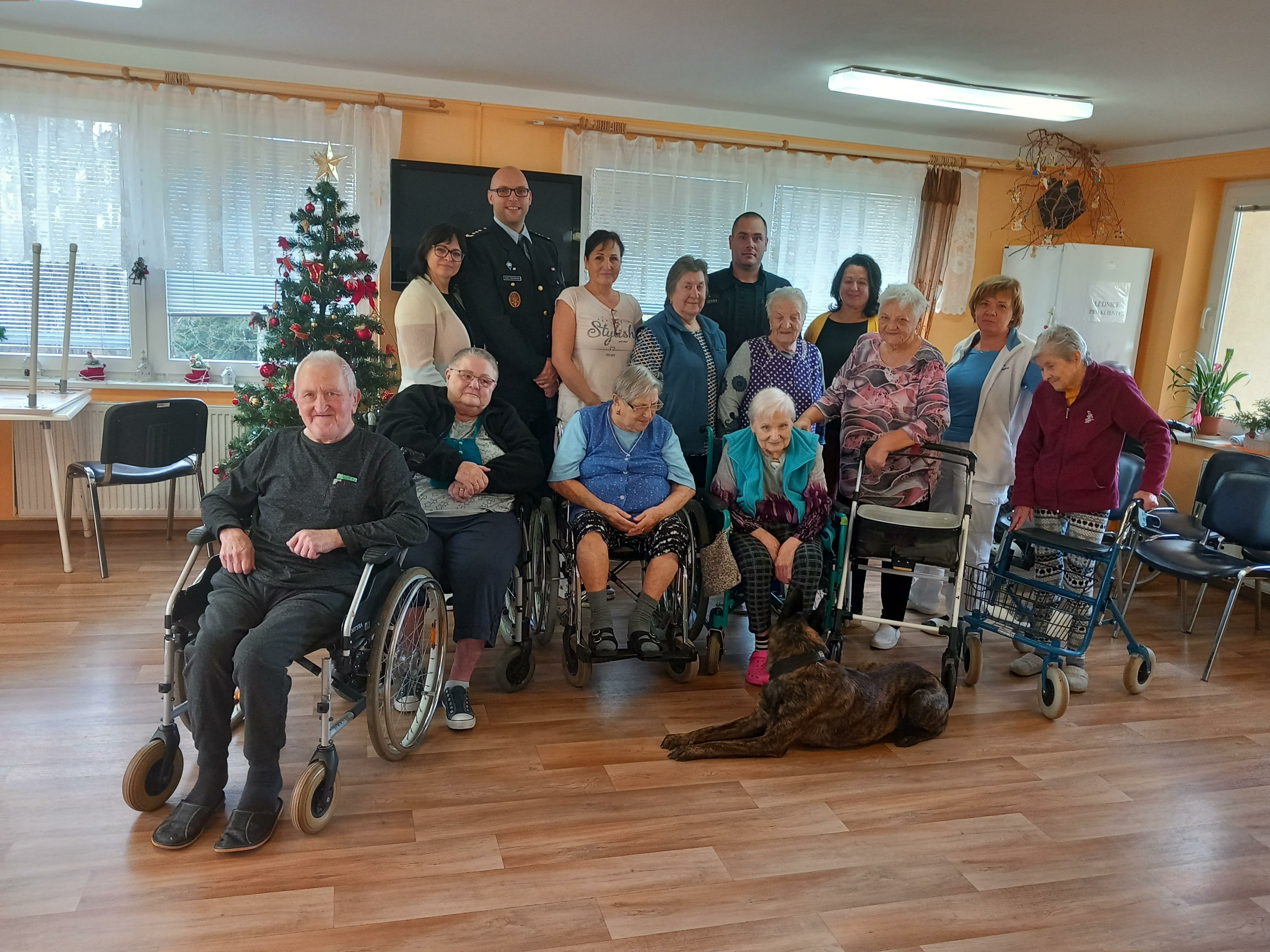 Velkou radost udělalo seniorům setkání se služebním psem Čertem, který jim předvedl některé své dovednosti. Čert byl velmi přátelský a kontaktní a rád se nechal od mnohých pohladit a zapózoval i při společném focení.