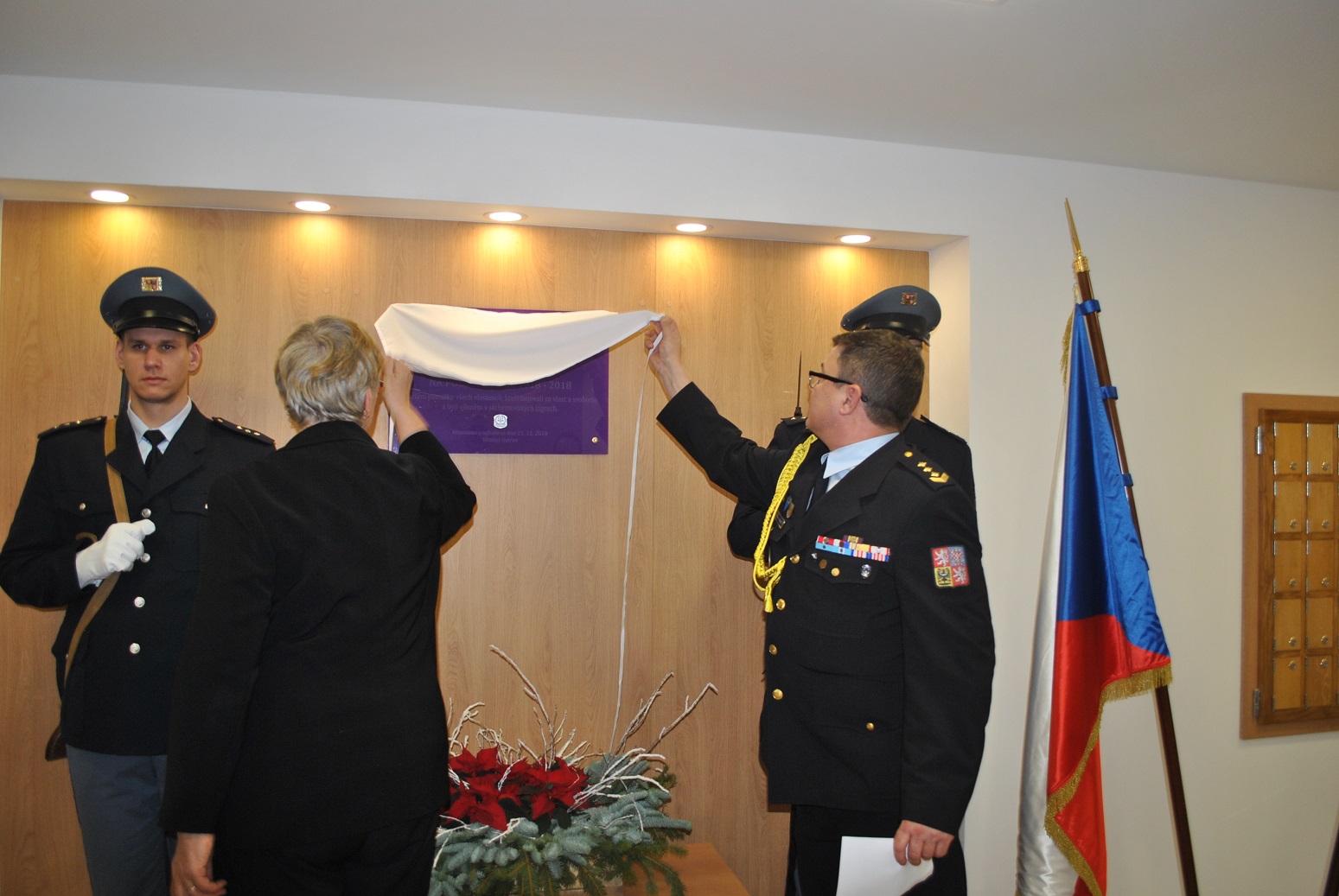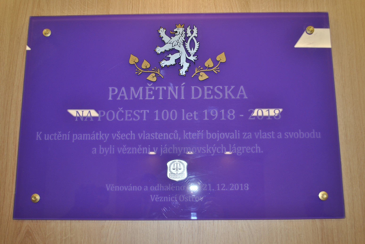 OSTROV 21. prosince 2018 (VS ČR) V rámci oslav „Dne českého vězeňství“ Byla v nově zrekonstruovaném vstupním vestibulu do administrativní budovy věznice odhalena pamětní deska k uctění památky všech vlastenců, kteří bojovali za vlast a svobodu a byli vězněni v jáchymovských lágrech. Tuto pamětní desku společně odhalili ředitel věznice plk. Ing. Pavel Zange a předsedkyně karlovarské pobočky Konfederace politických vězňů Vlasta Preislerová.