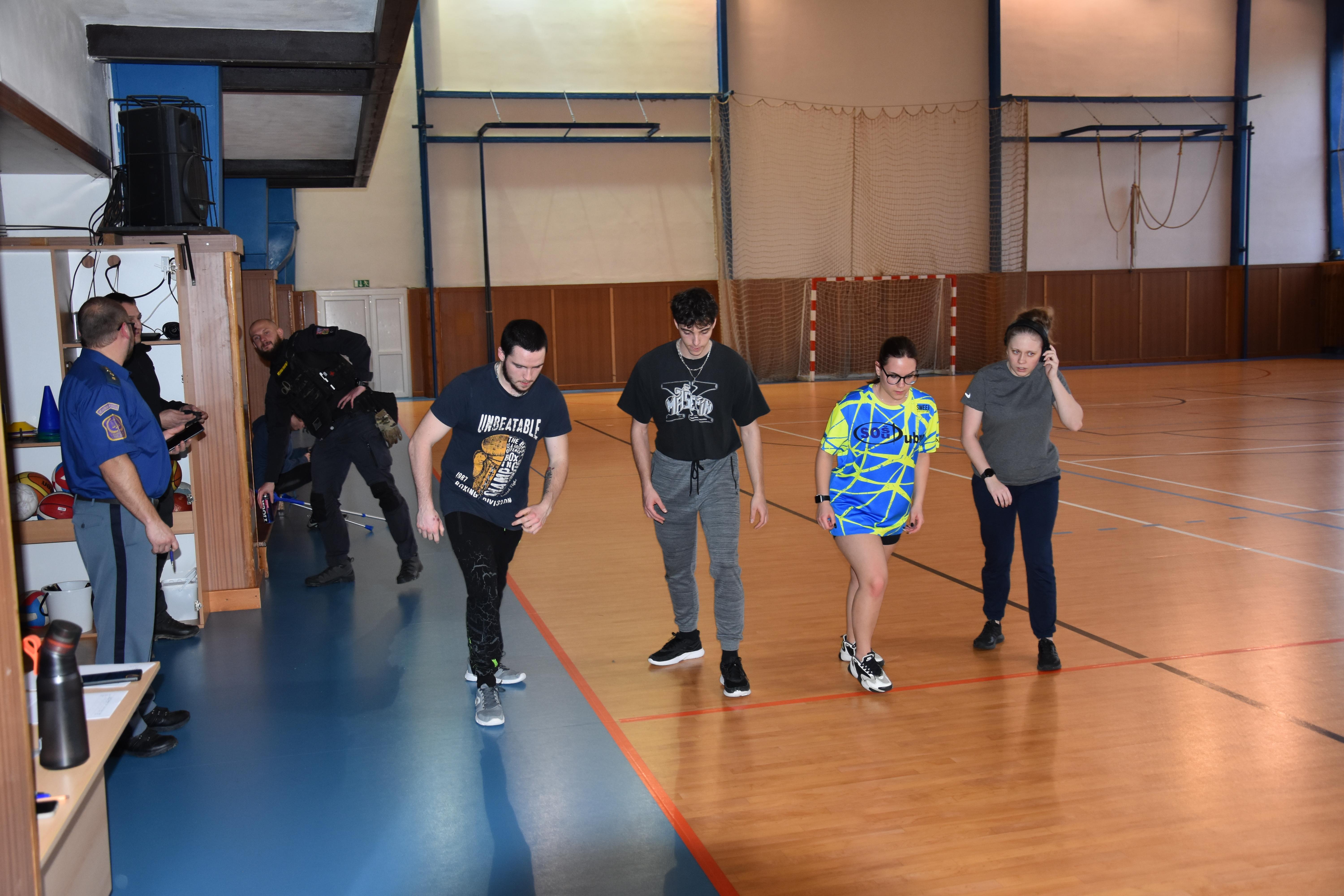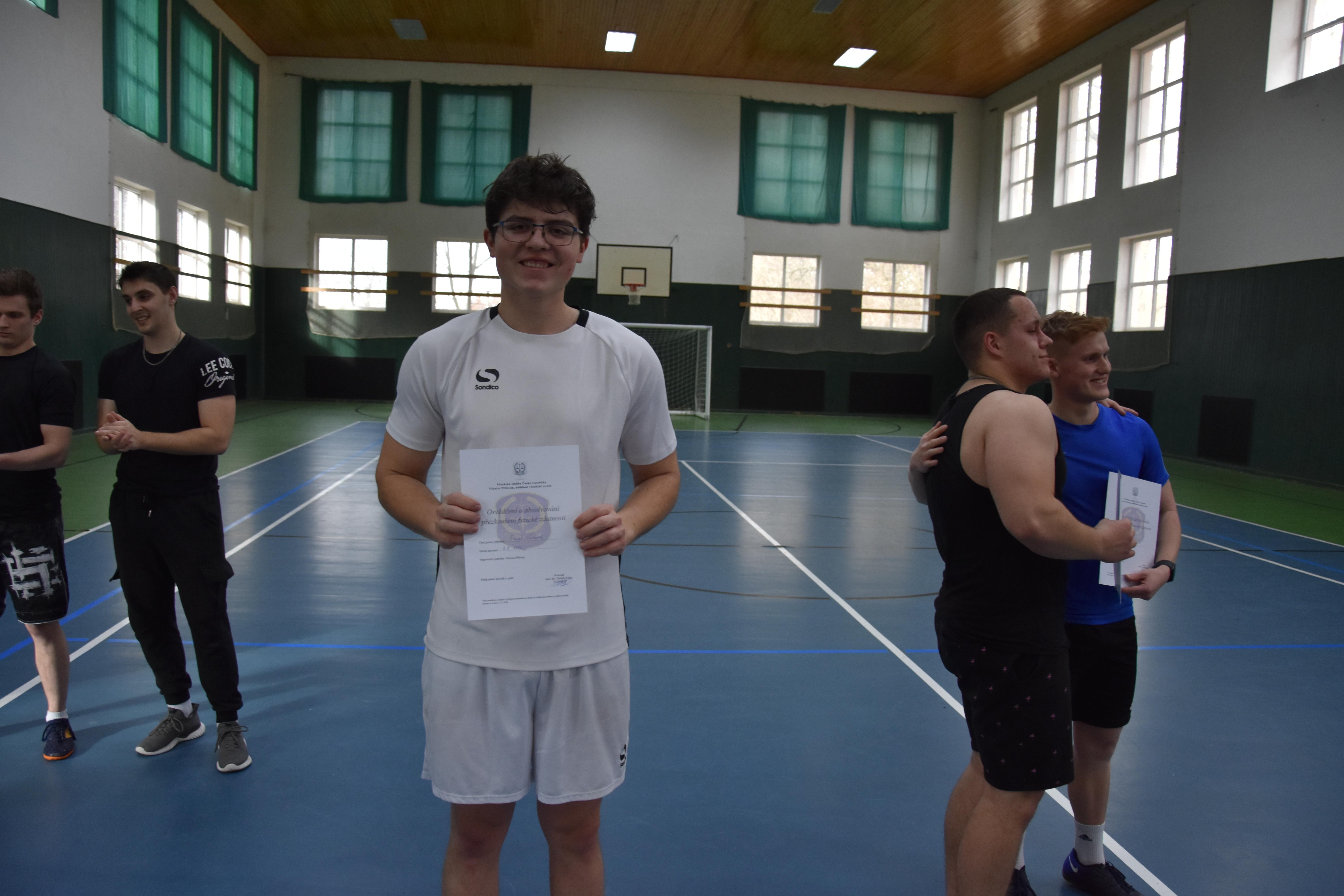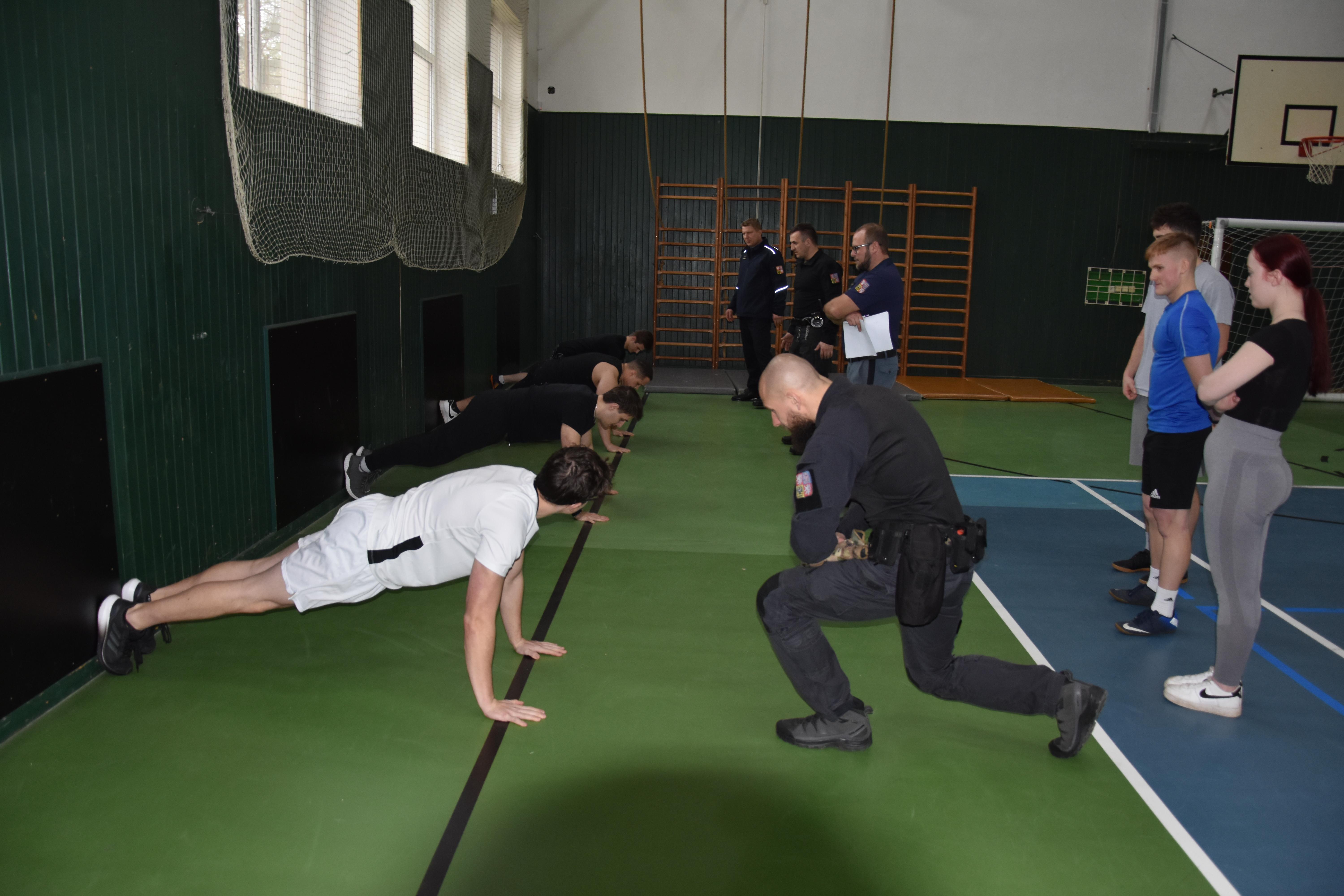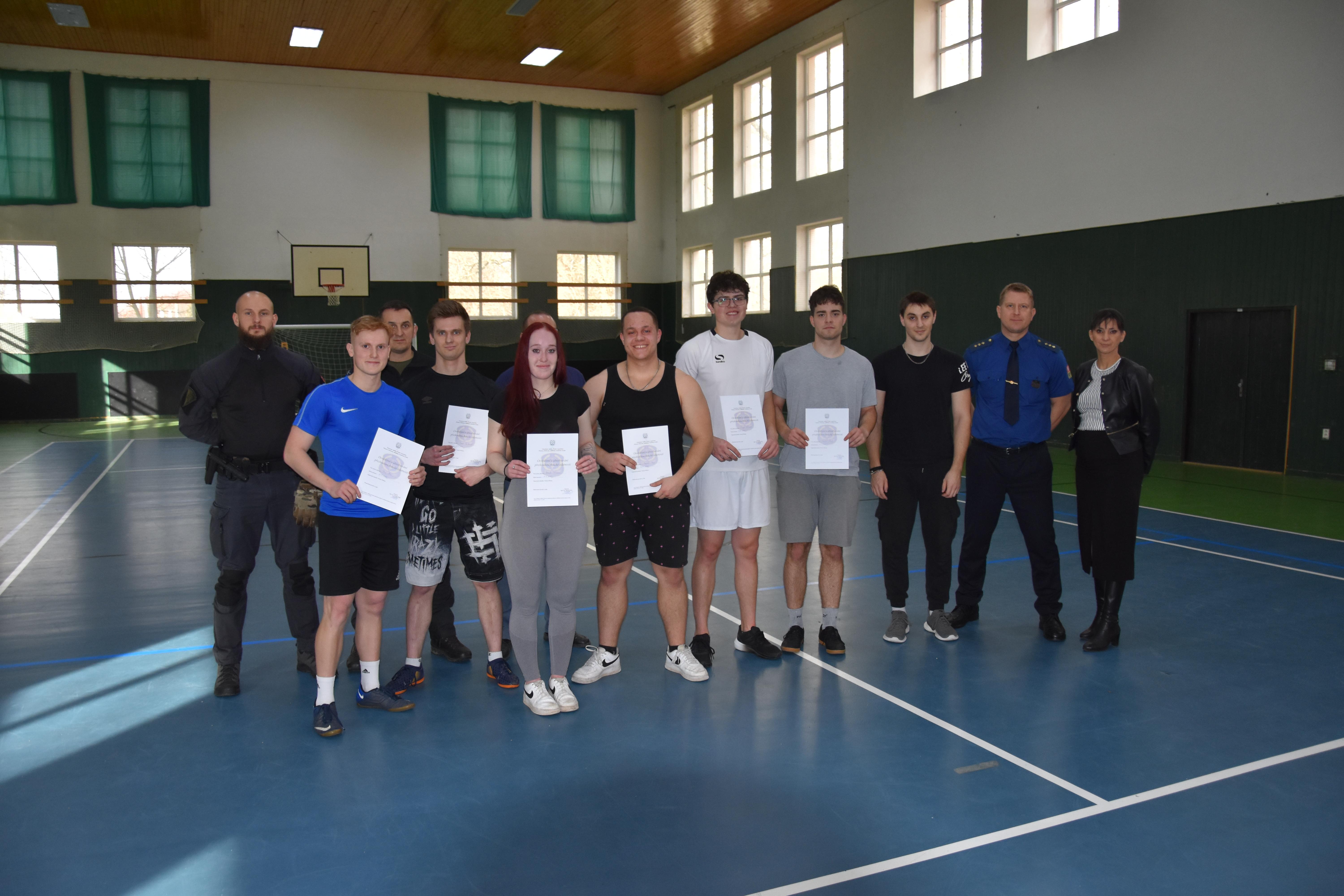 Druhá část návštěvy byla zaměřena na ověření fyzické zdatnosti případných zájemců o službu v našem sboru. Studenti dostali možnost vyzkoušet si, co vše musí potencionální uchazeči do služebního poměru ve VS ČR absolvovat v rámci fyzických testů. Tomu, kdo splnil požadovaná kritéria, byl předán certifikát o absolvování fyzických testů s platností jednoho roku. Pokud tato osoba projeví zájem o práci ve Věznici Příbram, bude k platnému certifikátu při přijímacím řízení přihlédnuto.