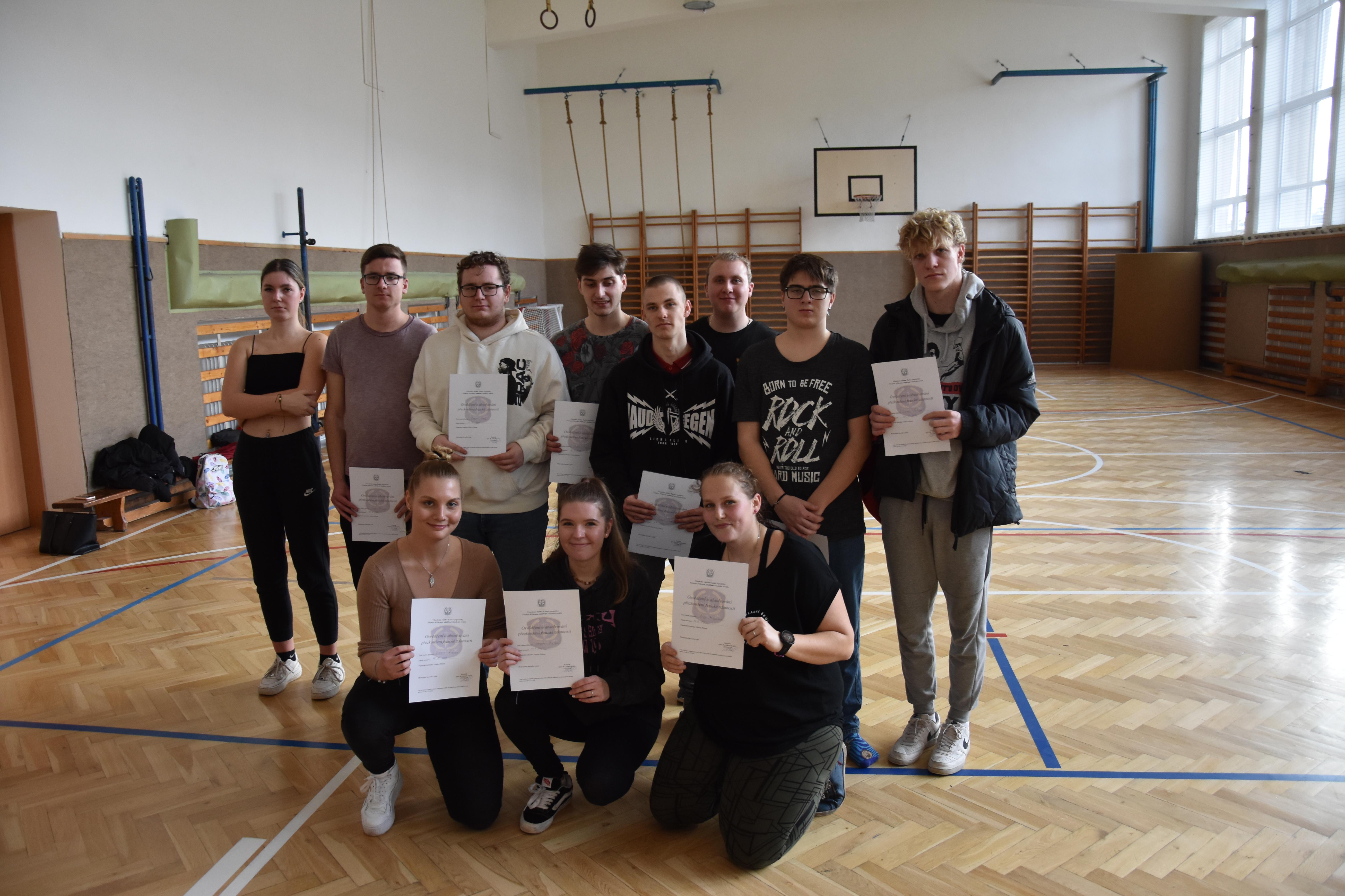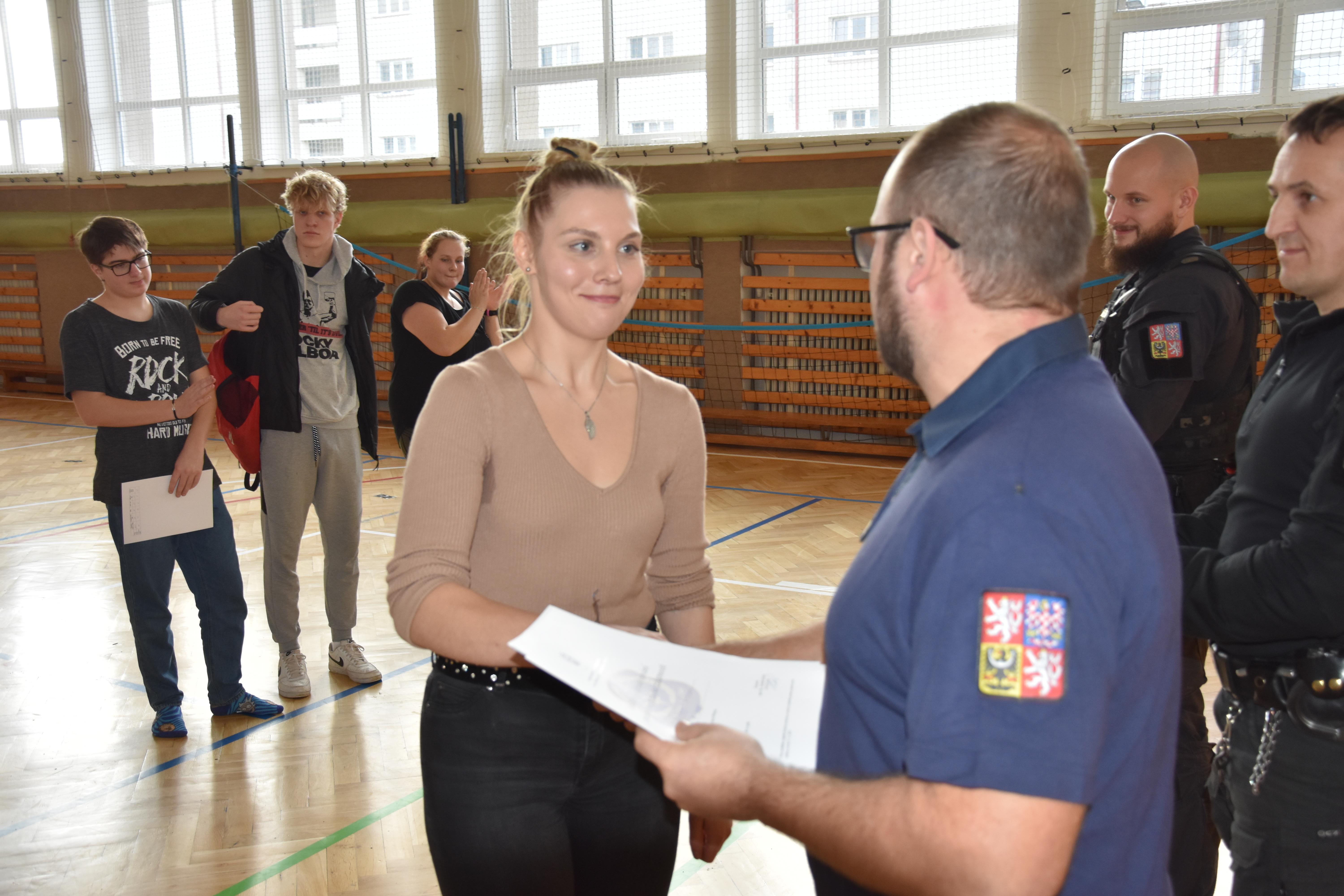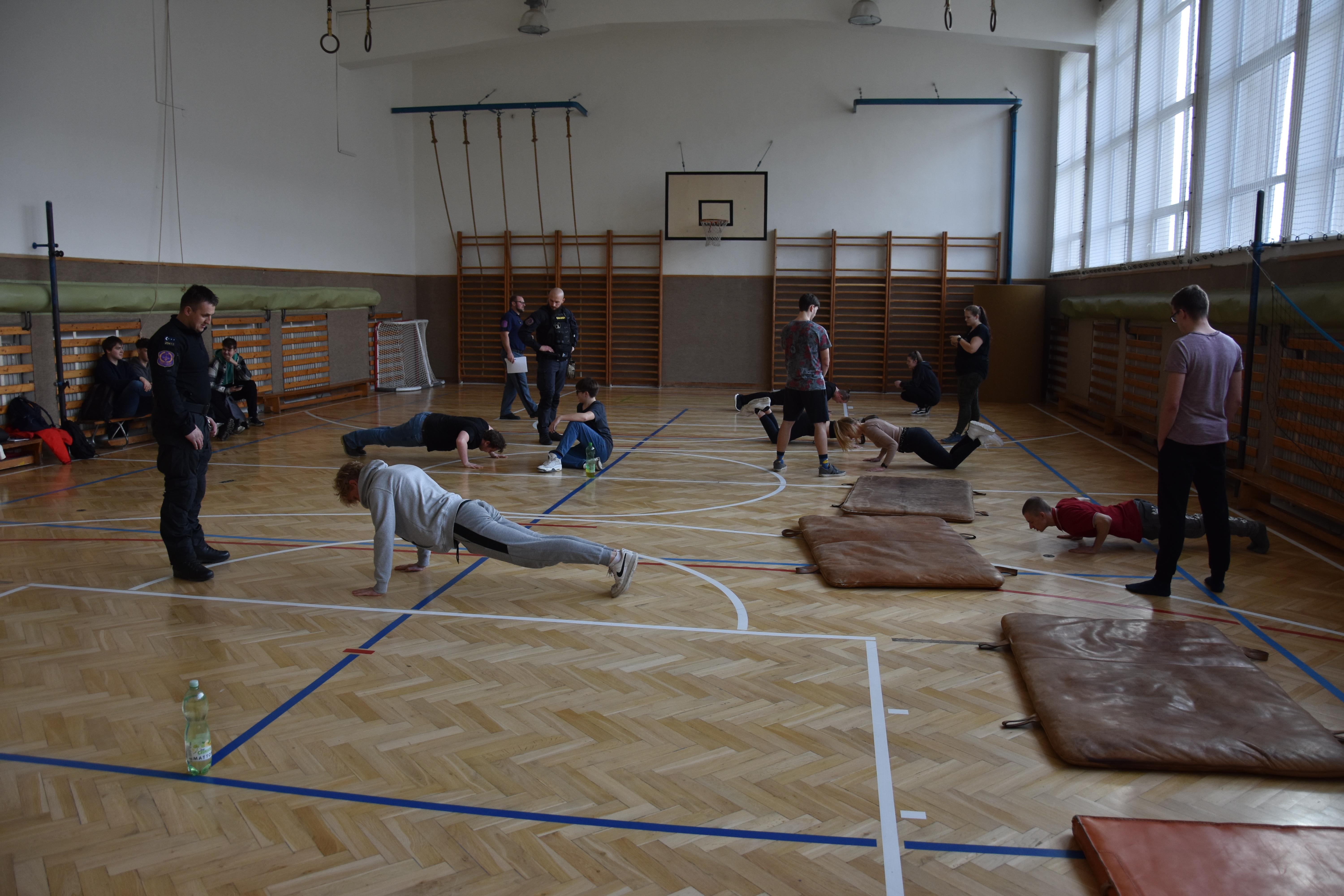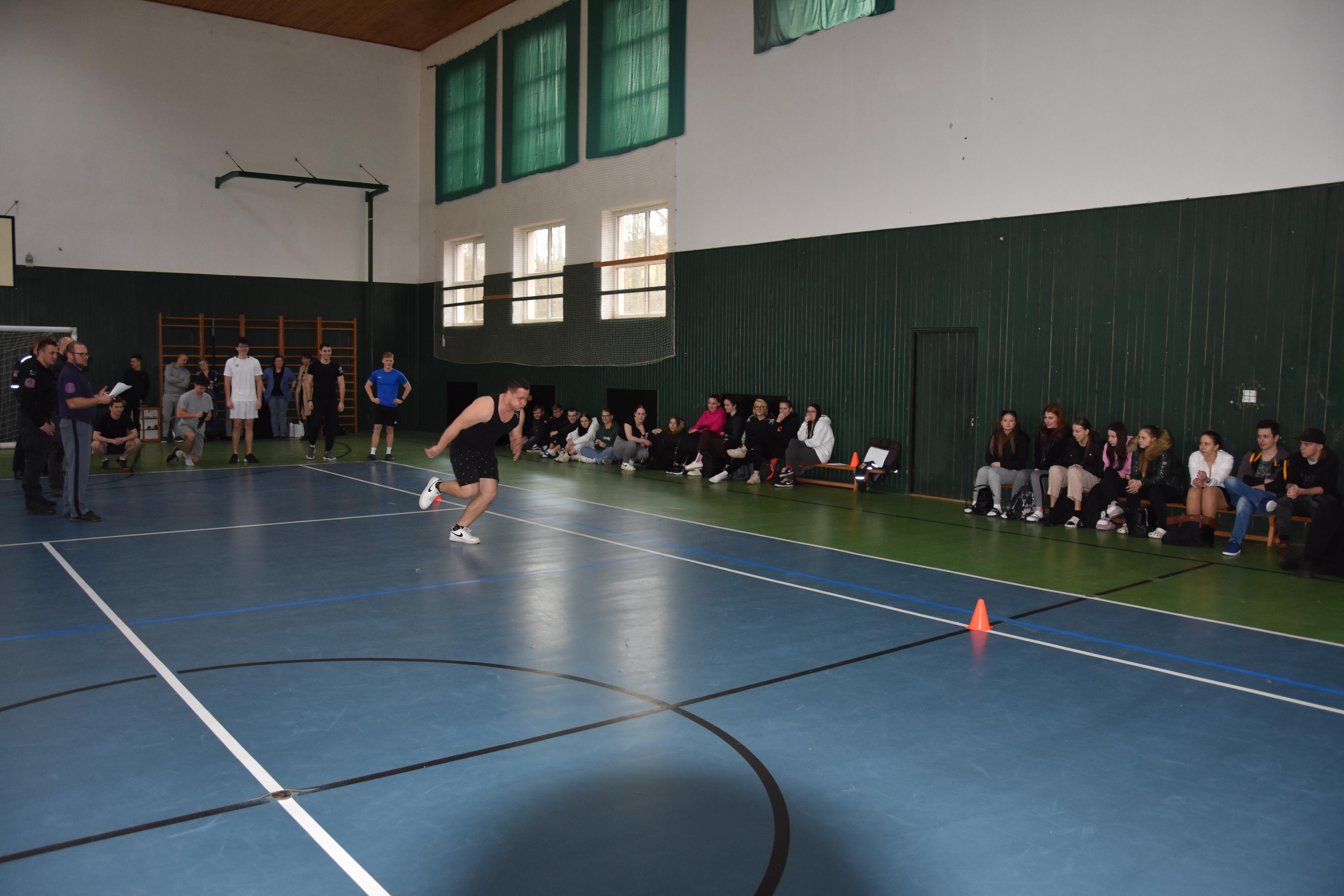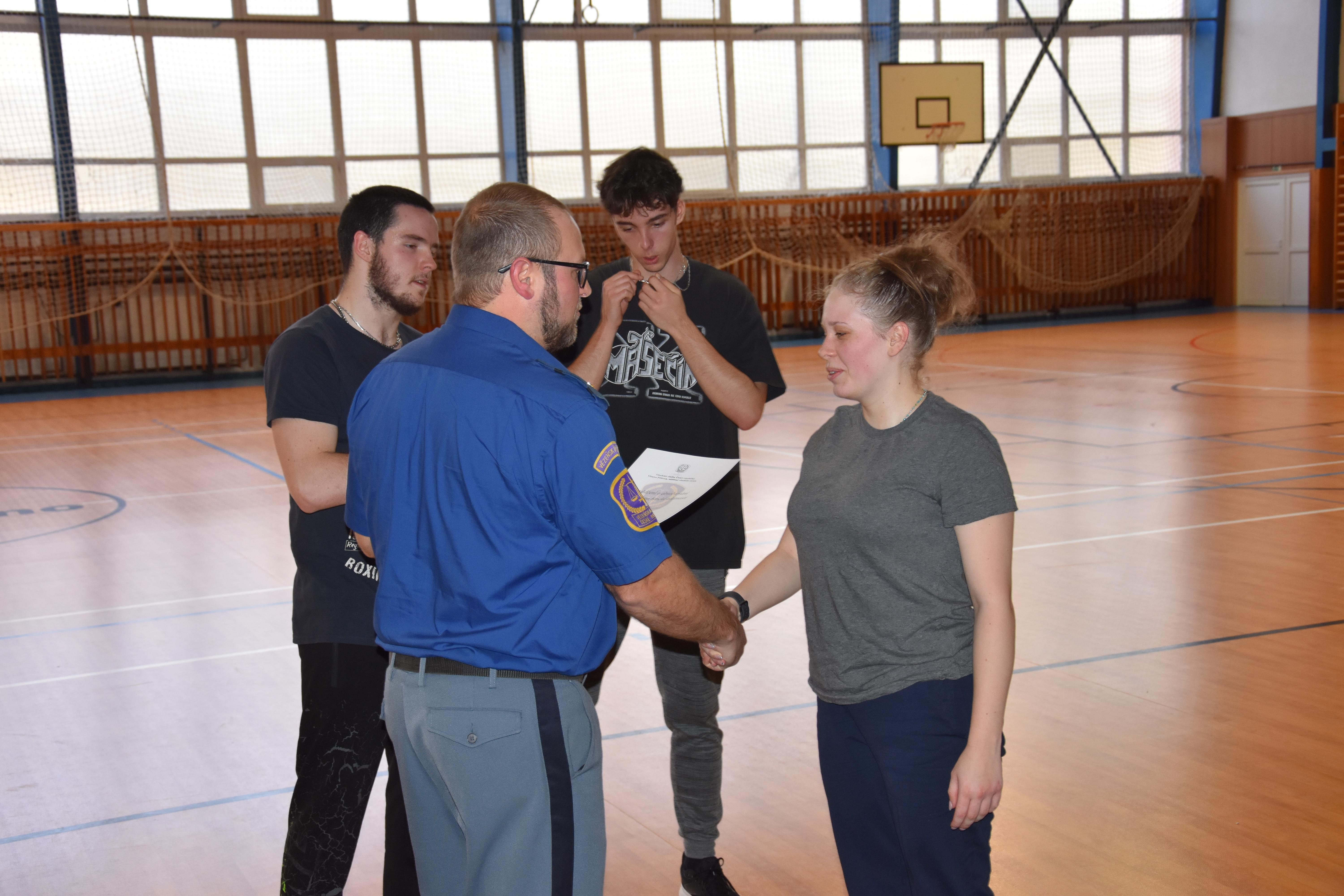Druhá část návštěvy byla zaměřena na ověření fyzické zdatnosti případných zájemců o službu v našem sboru. Studenti dostali možnost vyzkoušet si, co vše musí potencionální uchazeči do služebního poměru ve VS ČR absolvovat v rámci fyzických testů. Tomu, kdo splnil požadovaná kritéria, byl předán certifikát o absolvování fyzických testů s platností jednoho roku. Pokud tato osoba projeví zájem o práci ve Věznici Příbram, bude k platnému certifikátu při přijímacím řízení přihlédnuto.
