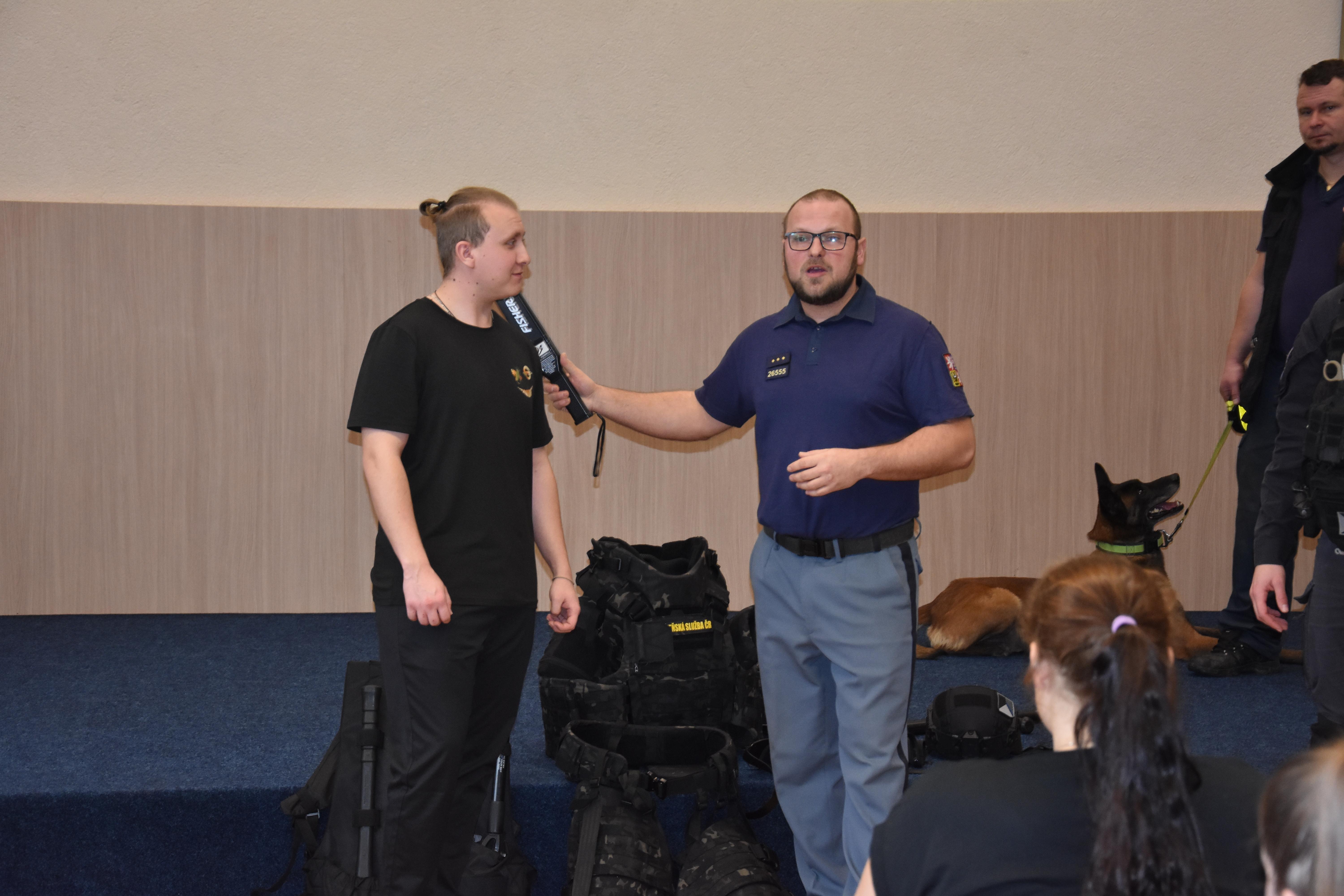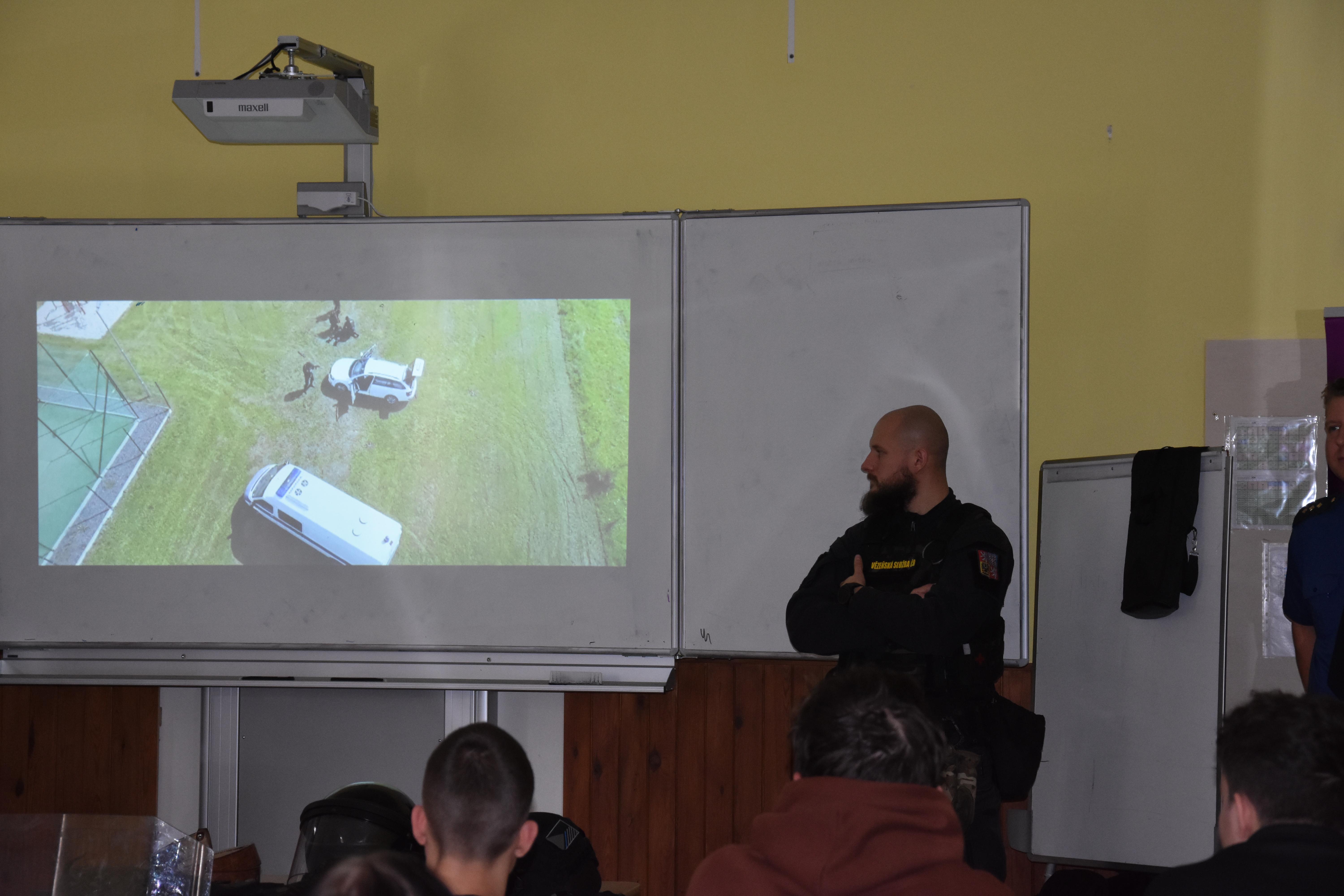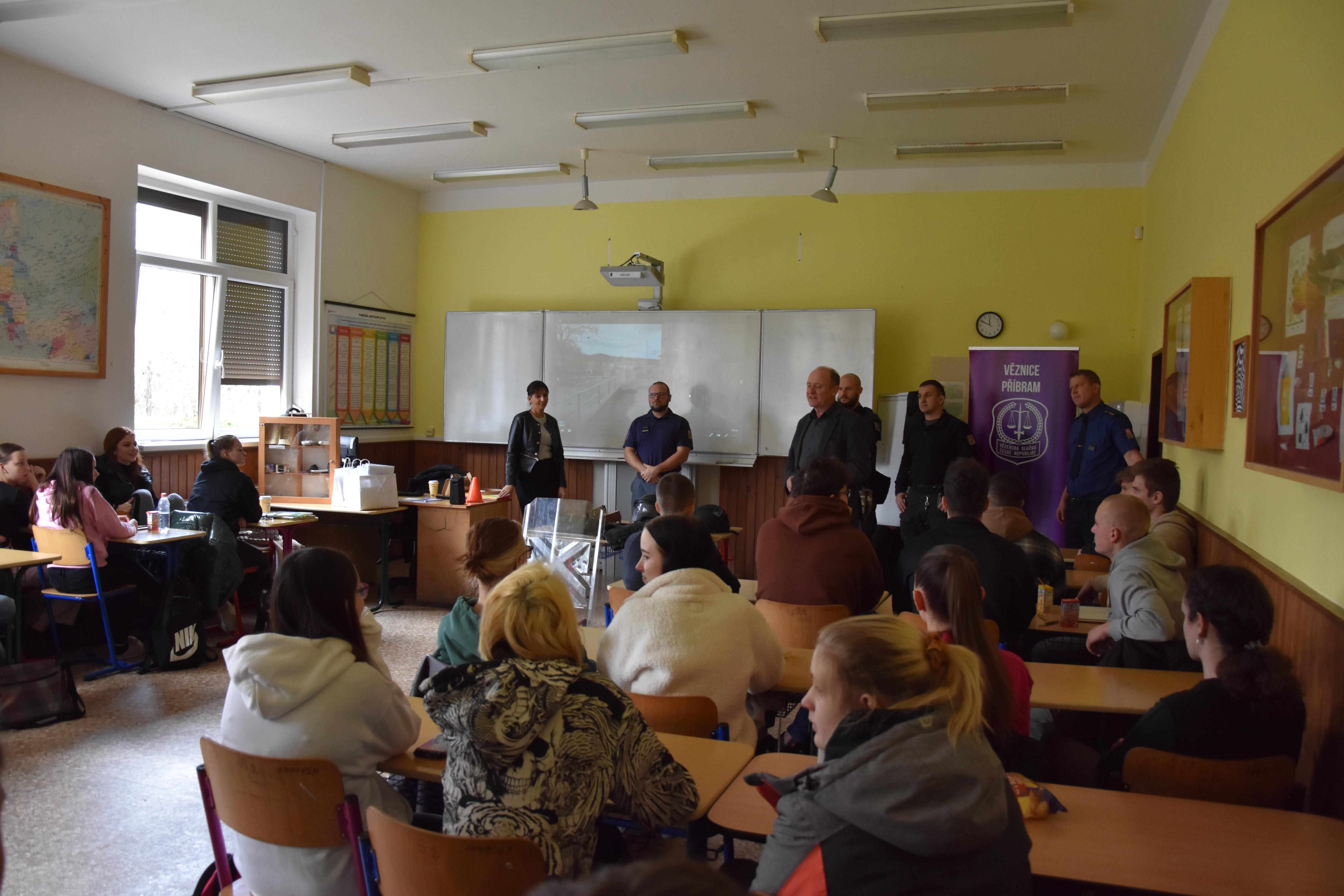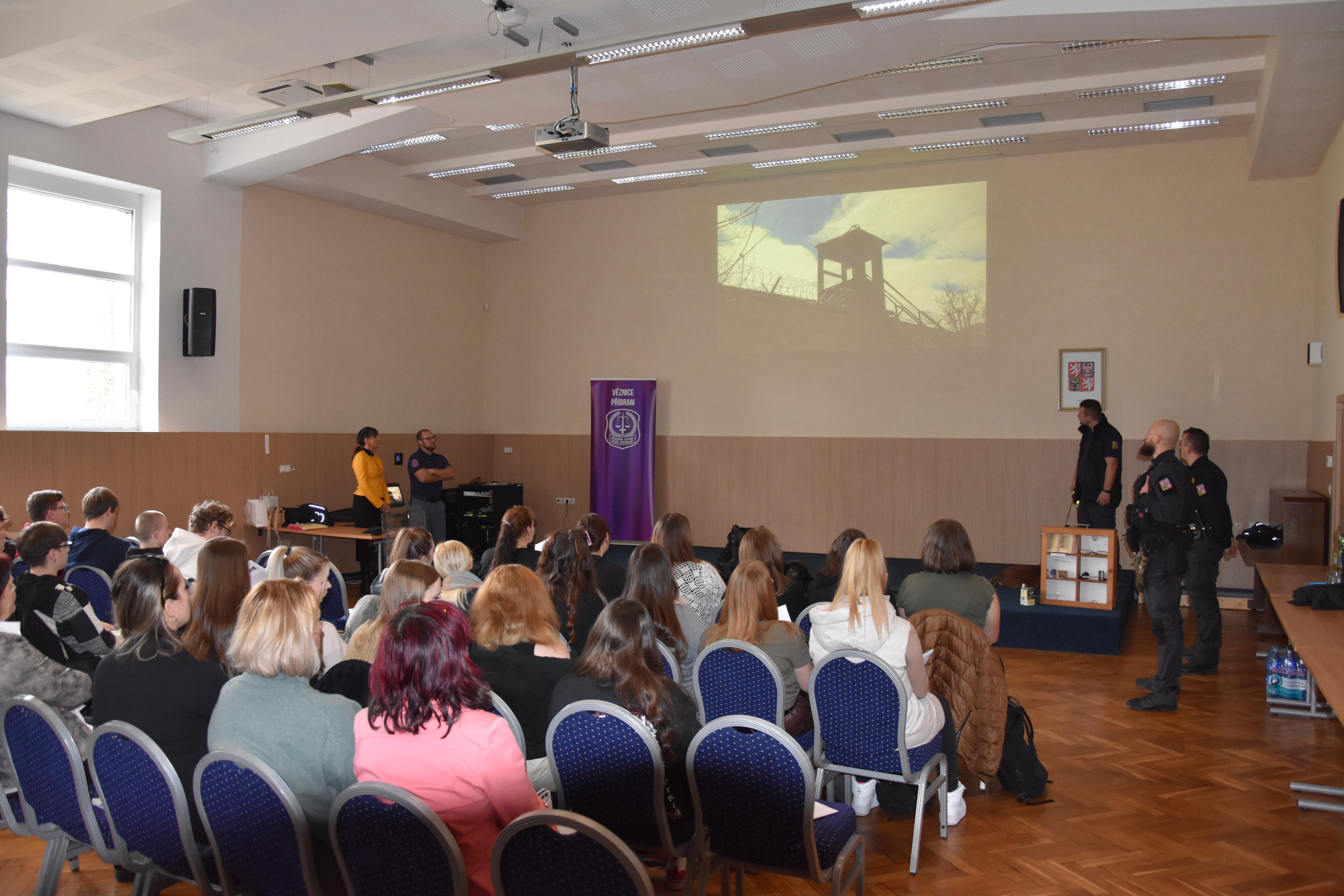 První tvořila teorie, kdy studenti shlédli krátké informační video o příbramské věznici. Následovala prezentace zaměřená na kritéria přijetí uchazeče do služebního poměru, informace o vězeňské službě a vše s tím spojené. Přítomní příslušníci vězeňské stráže a dozorčí služby odpovídali na dotazy studentů z oblasti jejich služebních činností. Pro ukázku konkrétního výkonu služby bylo prezentováno video z cvičného zákroku příslušníků při eskortě nebezpečné osoby a umožněno prohlédnout si zajištěné nepovolené předměty vězněných osob. Za dohledu příslušníků měli možnost studenti si vyzkoušet přiložení donucovacích prostředků.