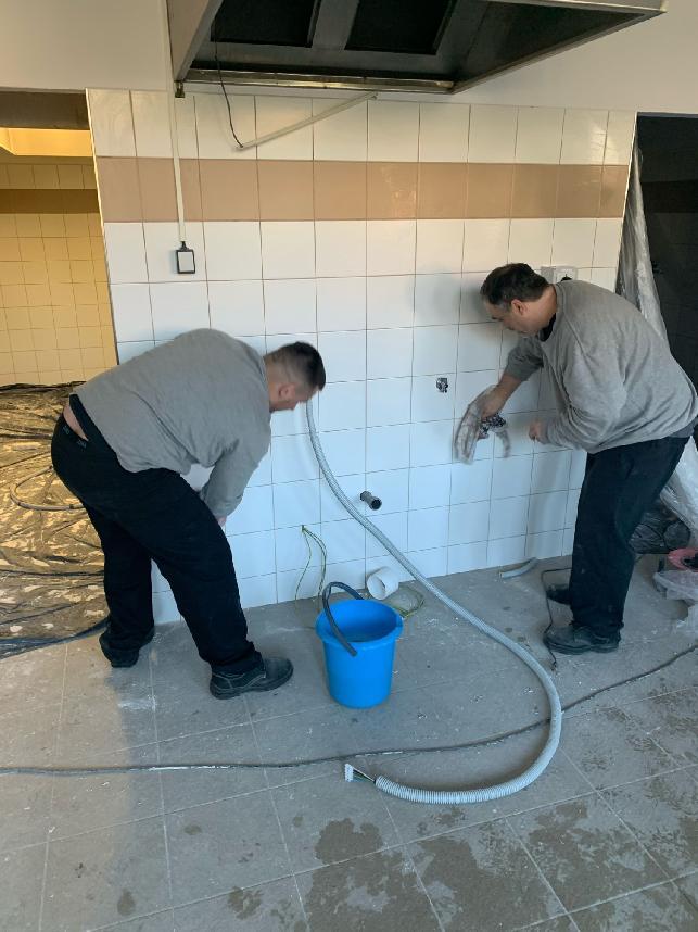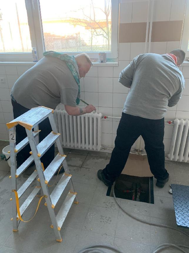 RÝNOVICE 24. března (VS ČR) - Základní škola v Rýnovicích se ocitla v nečekané situaci. Rozsáhlá závada rozvodů vody vyřadila z provozu školní kuchyni, zasaženy byly i přilehlé prostory, školní družina a chodba. Ředitel věznice Petr Veselý vyslal, na základě prosby ředitelky školy Jany Mašindové, na pomoc 12 odsouzených, kteří v minulém týdnu pomáhali tuto situaci řešit.