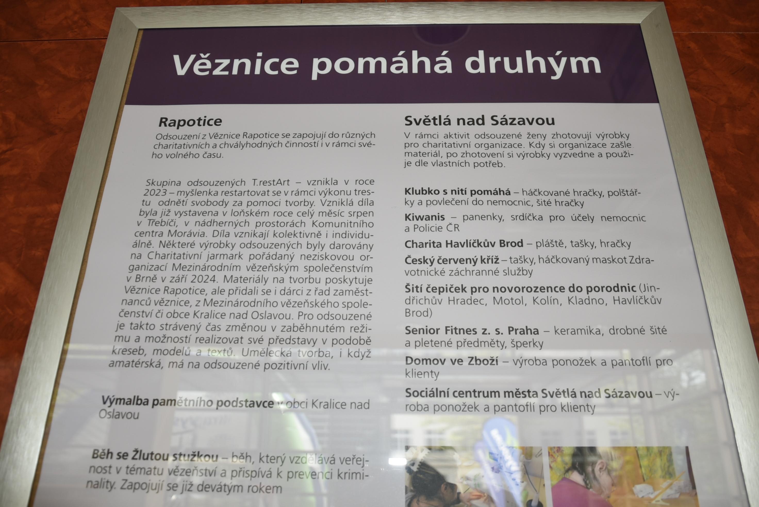 Výstava pod názvem Tvorba za mřížemi aneb v base jenom nesedím, kterou uspořádala Věznice Světlá nad Sázavou ve spolupráci s Věznicí Rapotice, byla slavnostně zahájena v úterý 3. června za účasti ředitelky světelské věznice Moniky Myšičkové a 1. zástupce ředitele Věznice Rapotice Vojtěcha Kabelky. Mezi pozvanými hosty byl regionální ředitel a ředitel Věznice Brno Dušan Gáč, krajský radní pro sociální oblast Jiří Horký a bývalý hejtman Kraje Vysočina Vítězslav Schrek. O hudební doprovod se postaraly vězeňské kapely Katrband a Al-Catraz.