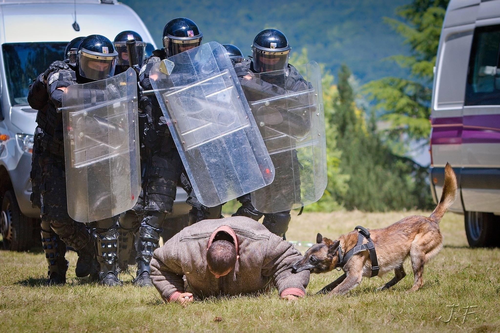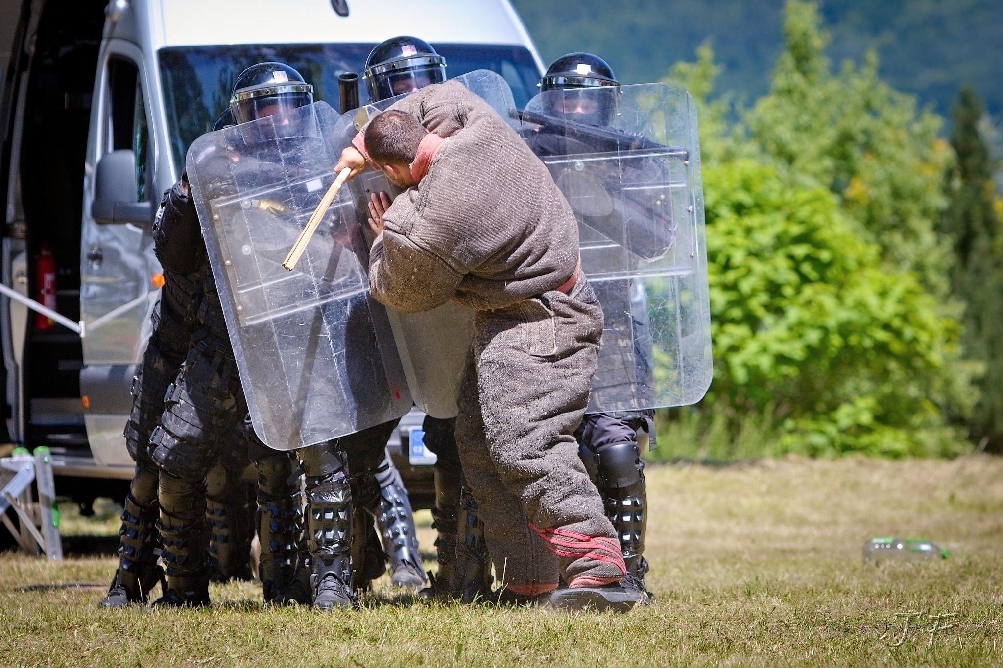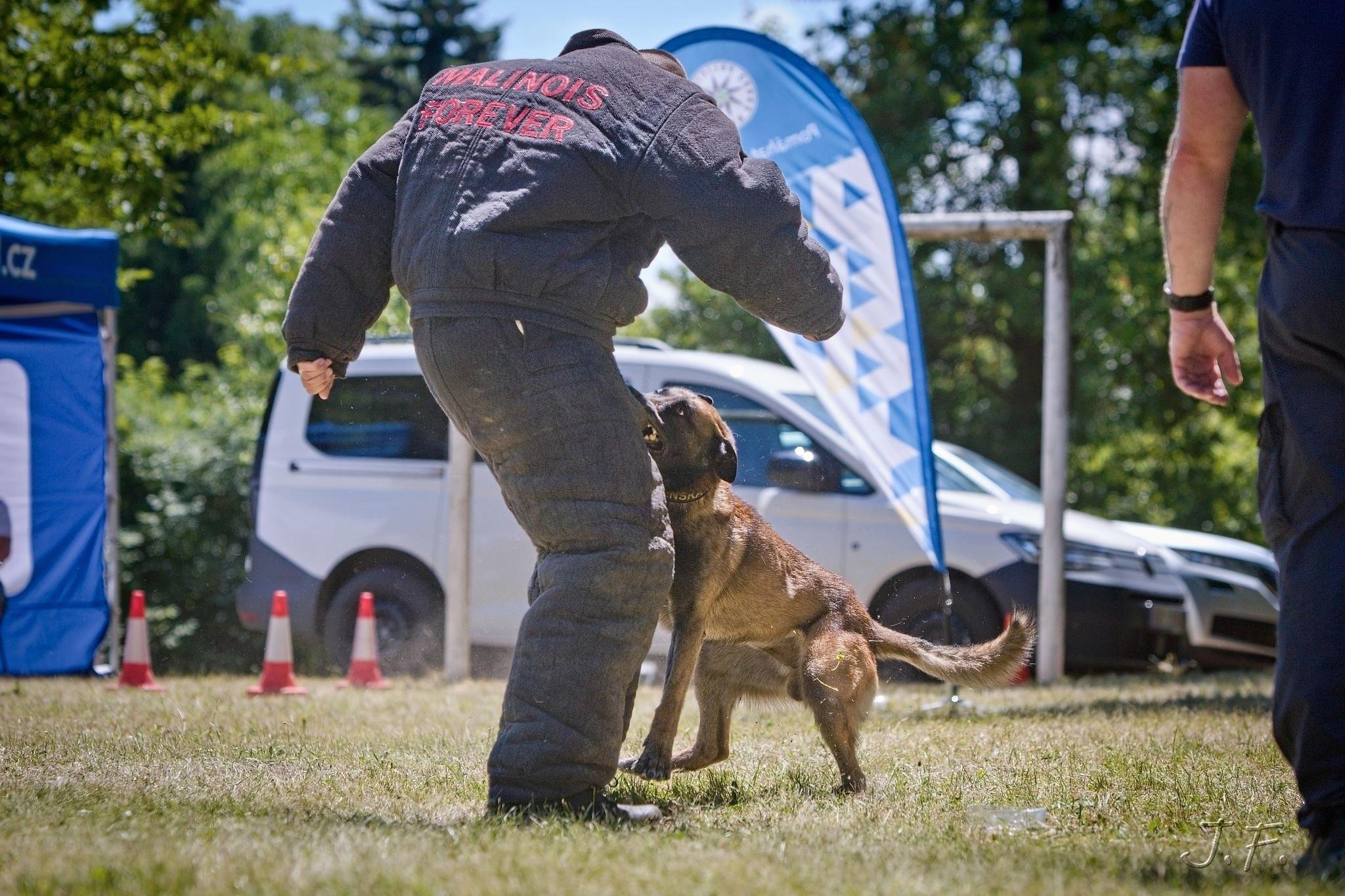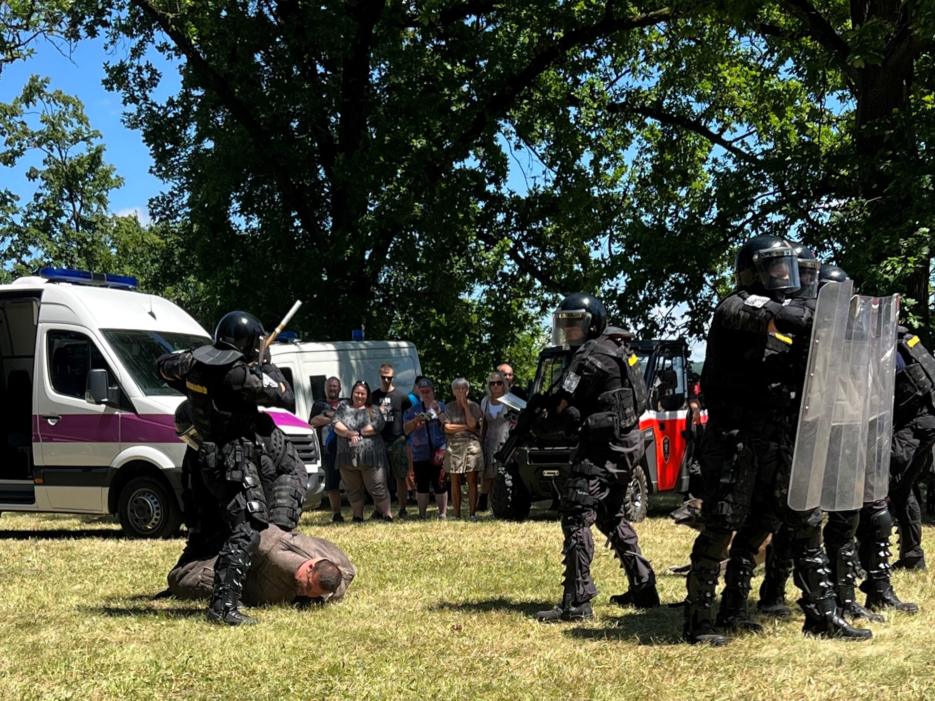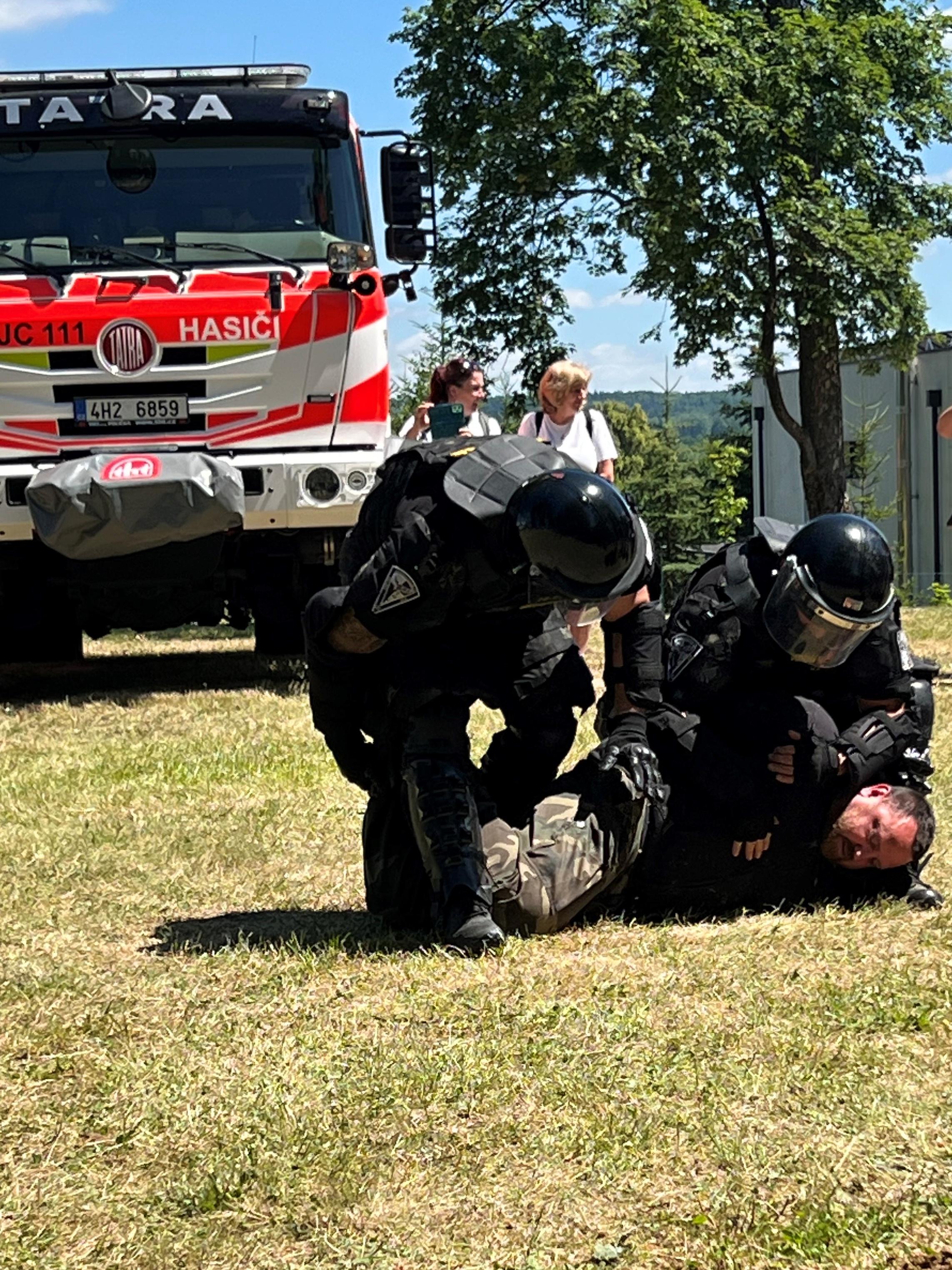 Závěrem příslušníci operativně eskortní skupiny předvedli dynamickou ukázku zneškodnění nebezpečného pachatele za pomoci donucovacích prostředků i služebního psa.