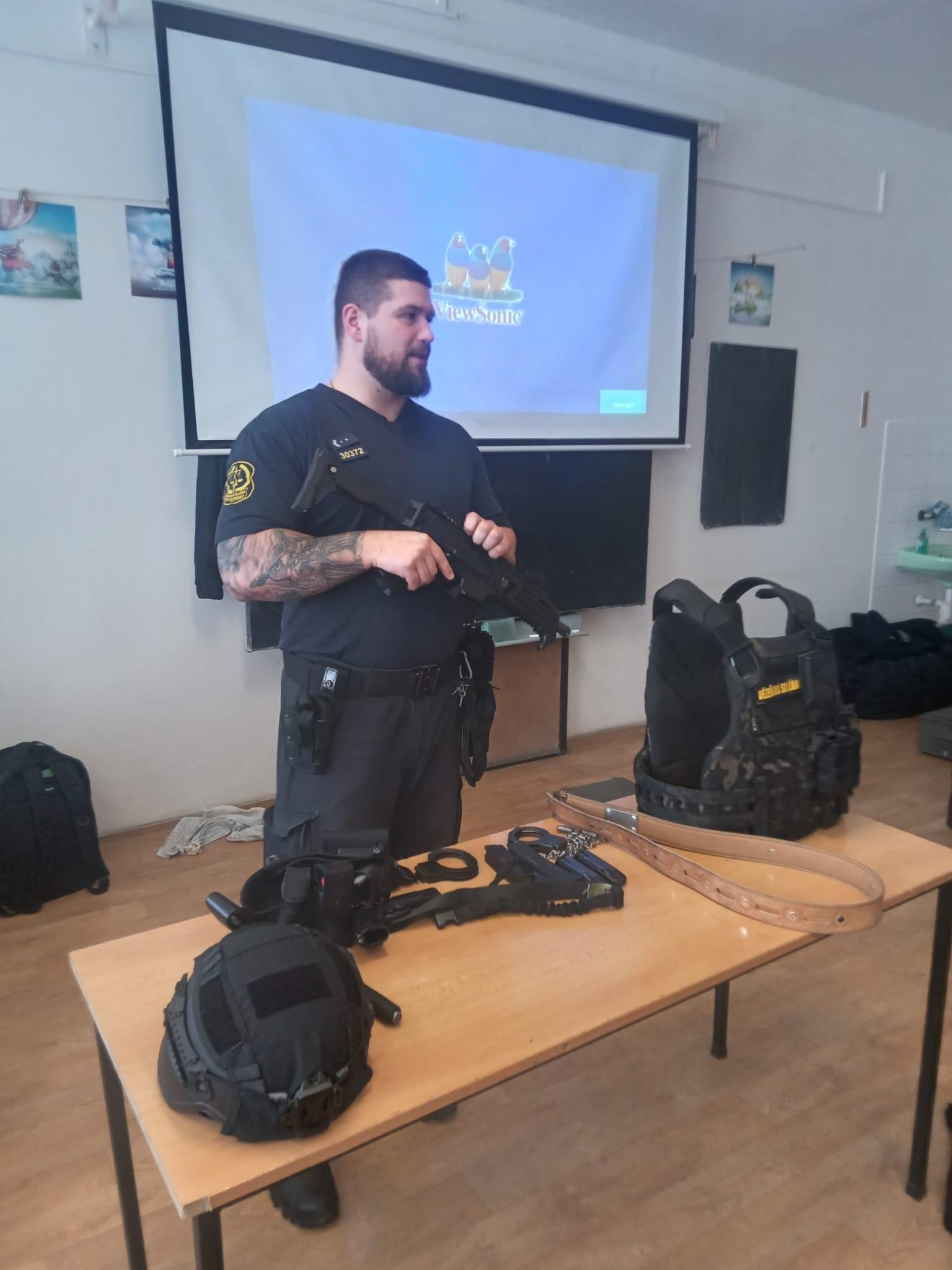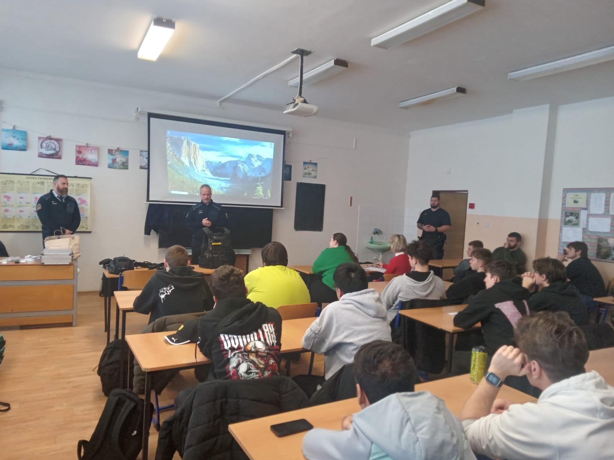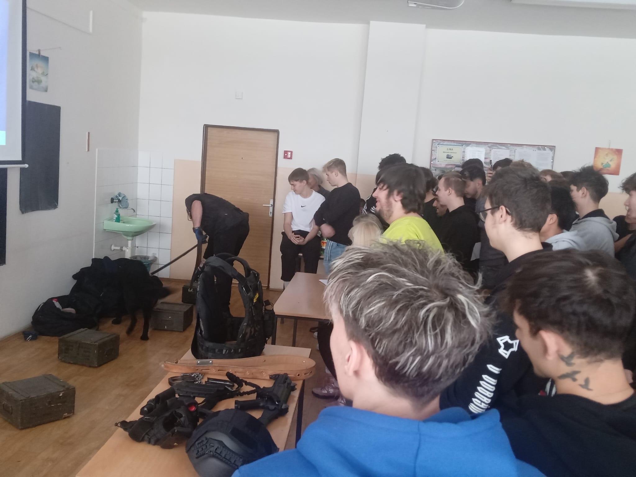 Před čtyři třídy maturitních ročníků předstoupila personalistka, spolu s příslušníky oddělení výkonu trestu, vězeňské stráže a oddělení prevence a stížností. Nastínila studentům, jaké požadavky musí uchazeč o přijetí do služebního poměru splnit, jaké je finanční ohodnocení, benefity. Psovod a jeho služební pes předvedli práci při odhalování možných návykových látek a příslušník z oddělení výkonu trestu přiblížil studentům svou práci. Na dobrovolníkovi ukázal poutání předváděných osob a přivezl s sebou i výstroj a výzbroj, kterou používají členové jednotky pod jednotným velením, což je taková vězeňská zásahovka. Studenti se na závěr nahrnuli ke stolku, potěžkávali zbraně i balistické vesty a živě diskutovali s příslušníky.