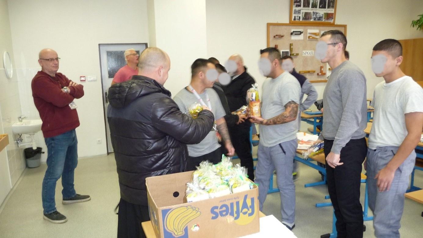 VŠEHRDY 13. 12. 2023 (ŠVS, VS ČR) – Budoucí truhláři a elektrikáři ze Školského vzdělávacího střediska ve Věznici Všehrdy dostali od nadace ČEZ vánoční balíčky. Předal je kaplan věznice Volodymyr Malskyj.