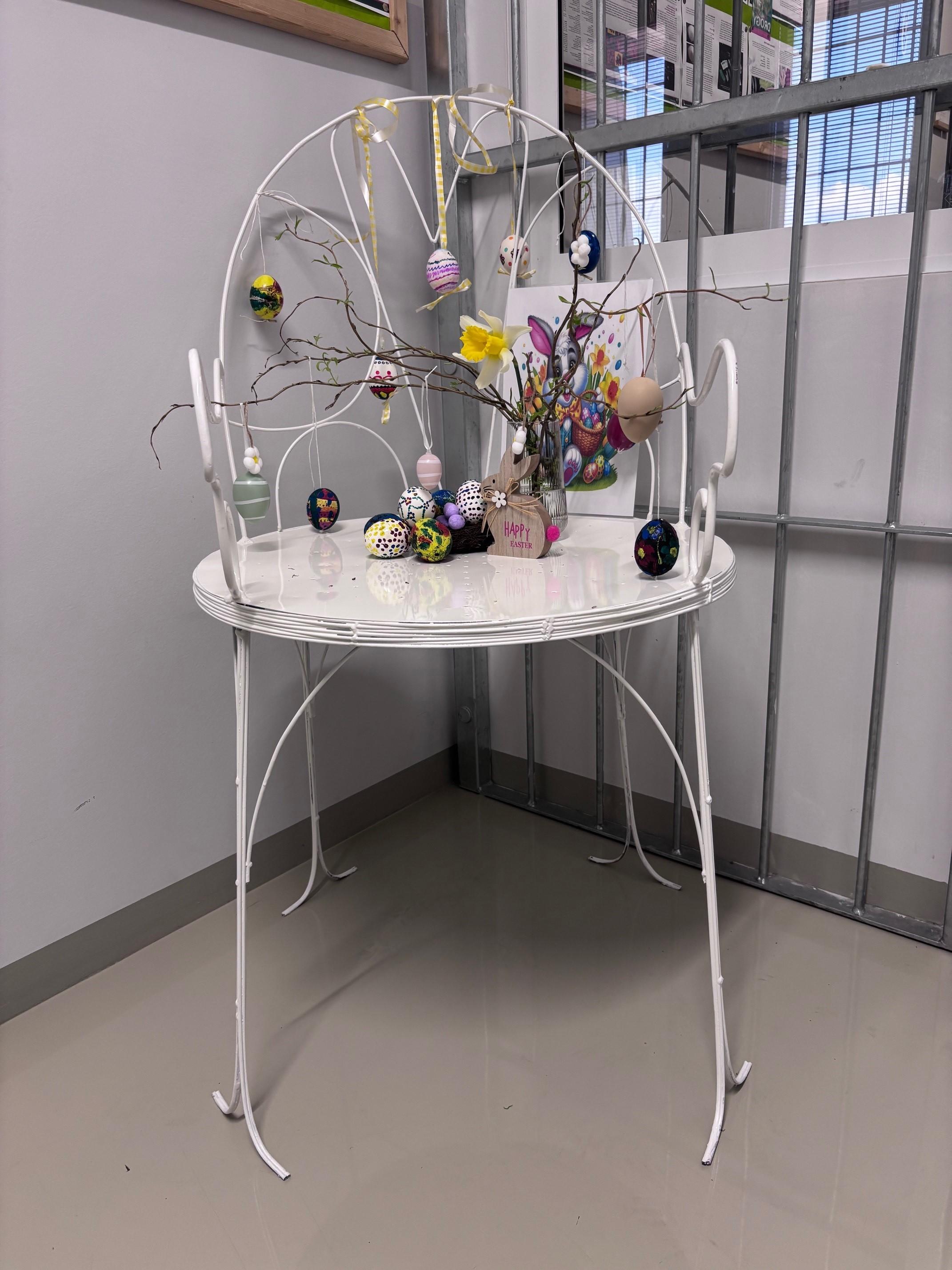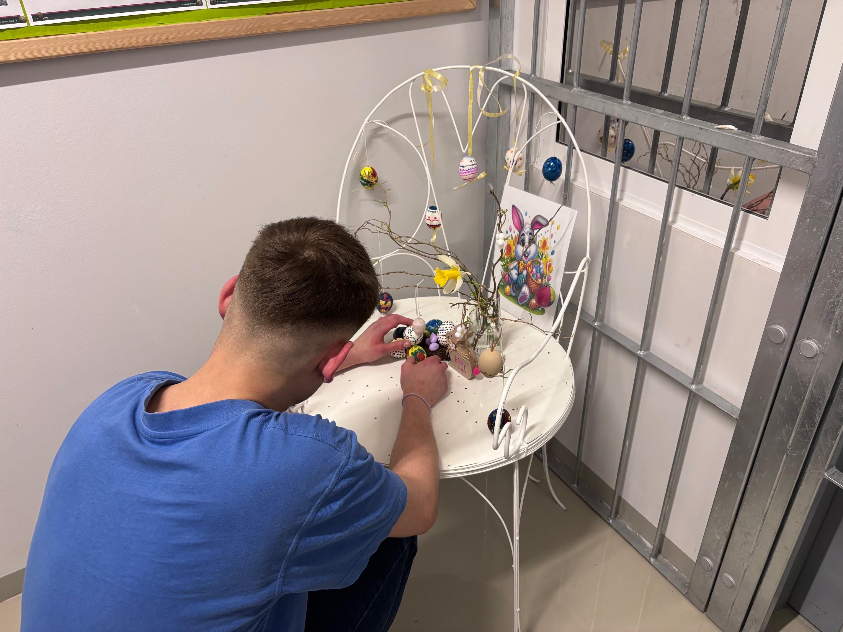 Mladí odsouzenci se jako každoročně pustili do zdobení velikonočních vajíček. Dnes dokončili výzdobu jedné z chodeb na oddíle, zkrášlili i terapeutickou místnost. Letos pojali dekoraci lehce romanticky. Ve spolupráci s vězni, kteří navštěvují kurz dělník v kovovýrobě na Školském vzdělávacím středisku, vyrobili kovové dekorační křesílko. To pak ověnčili vlastnoručně zdobenými kraslicemi. Koutek na chodbě působí romanticky a svěže. Při troše fantazie může připomínat klidné zahradní zákoutí vyzývající ke spočinutí a rozjímání. Možná o vině a trestu, možná o významu nadcházejících svátků.