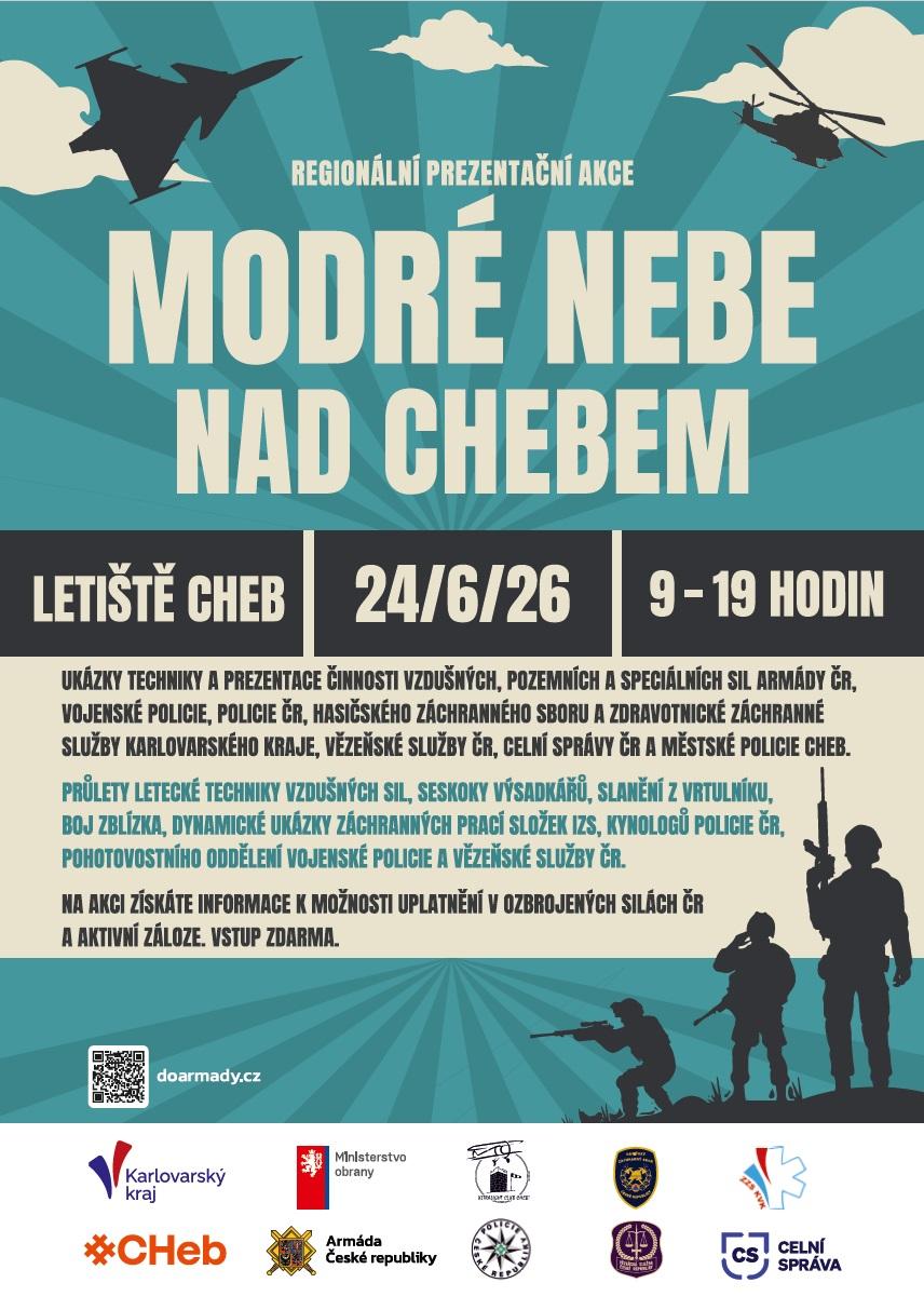 Věznice Kynšperk nad Ohří se představí v rámci regionální prezentační akce Modré nebe nad Chebem. K vidění budou ukázky techniky a prezentace činnosti vzdušných, pozemních a speciálních sil Armády ČR, Vojenské policie, Policie ČR, HZS a ZZS Karlovarského kraje, Celní správy ČR, Městské policie Cheb a Věznice Kynšperk nad Ohří.
